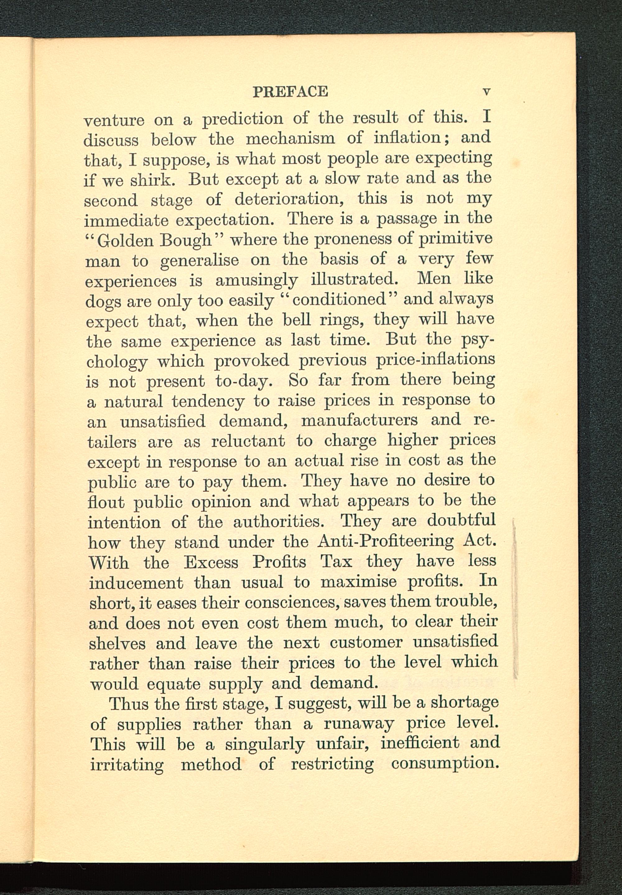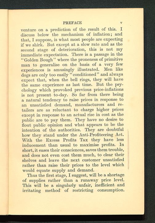 venture on a prediction of the result of this. Idiscuss below the mechanism of inflation; andthat, I suppose, is what most people are expectingif we shirk. But except at a slow rate and as thesecond stage of deterioration, this is not myimmediate expectation. There is a passage in the"Golden Bough" where the proneness of primitiveman to generalise on the basis of a very fewexperiences is amusingly illustrated. Men likedogs are only too easily "conditioned" and alwaysexpect that, when the bell rings, they will havethe same experience as last time. But the psy-chology which provoked previous price-inflationsis not present to-day. So far from there beinga natural tendency to raise prices in response toan unsatisfied demand, manufacturers and re-tailers are as reluctant to charge higher pricesexcept in response to an actual rise in cost as thepublic are to pay them. They have no desire toflout public opinion and what appears to be theintention of the authorities. They are doubtfulhow they stand under the Anti-Profiteering Act.With the Excess Profits Tax they have lessinducement than usual to maximise profits. Inshort, it eases their consciences, saves them trouble,and does not even cost them much, to clear theirshelves and leave the next customer unsatisfiedrather than raise their prices to the level whichwould equate supply and demand.