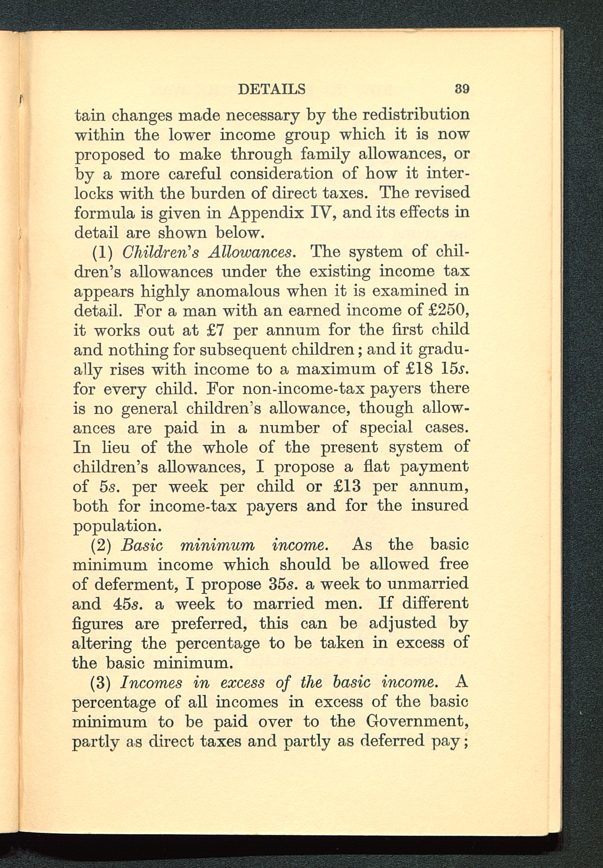 (1) Children''s Allowances. The system of chil-dren's allowances under the existing income taxappears highly anomalous when it is examined indetail. For a man with an earned income of £250,it works out at £7 per annum for the first childand nothing for subsequent children; and it gradu-ally rises with income to a maximum of £18 15^.for every child. For non-income-tax payers thereis no general children's allowance, though allow-ances are paid in a number of special cases.In lieu of the whole of the present system ofchildren's allowances, I propose a fiat paymentof 5s. per week per child or £13 per annum,both for income-tax payers and for the insuredpopulation.
