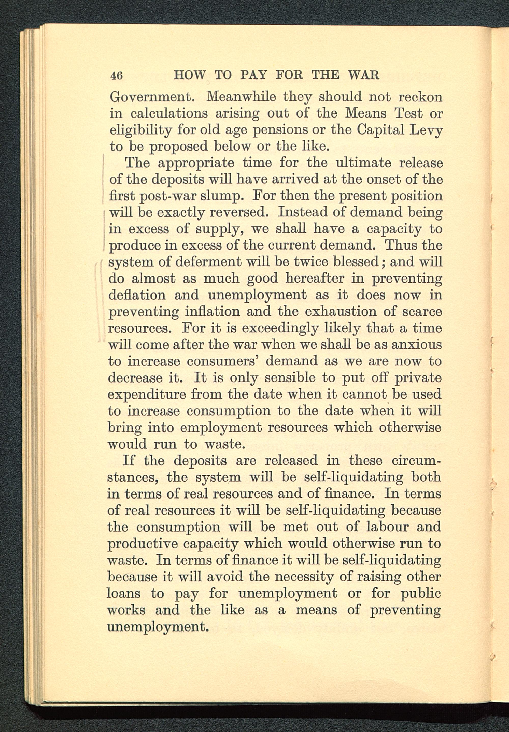 If the deposits are released in these circum-stances, the system will be self-liquidating bothin terms of real resources and of finance. In termsof real resources it will be self-liquidating becausethe consumption will be met out of labour andproductive capacity which would otherwise run towaste. In terms of finance it will be self-liquidatingbecause it will avoid the necessity of raising otherloans to pay for unemployment or for publicworks and the like as a means of preventingunemployment.