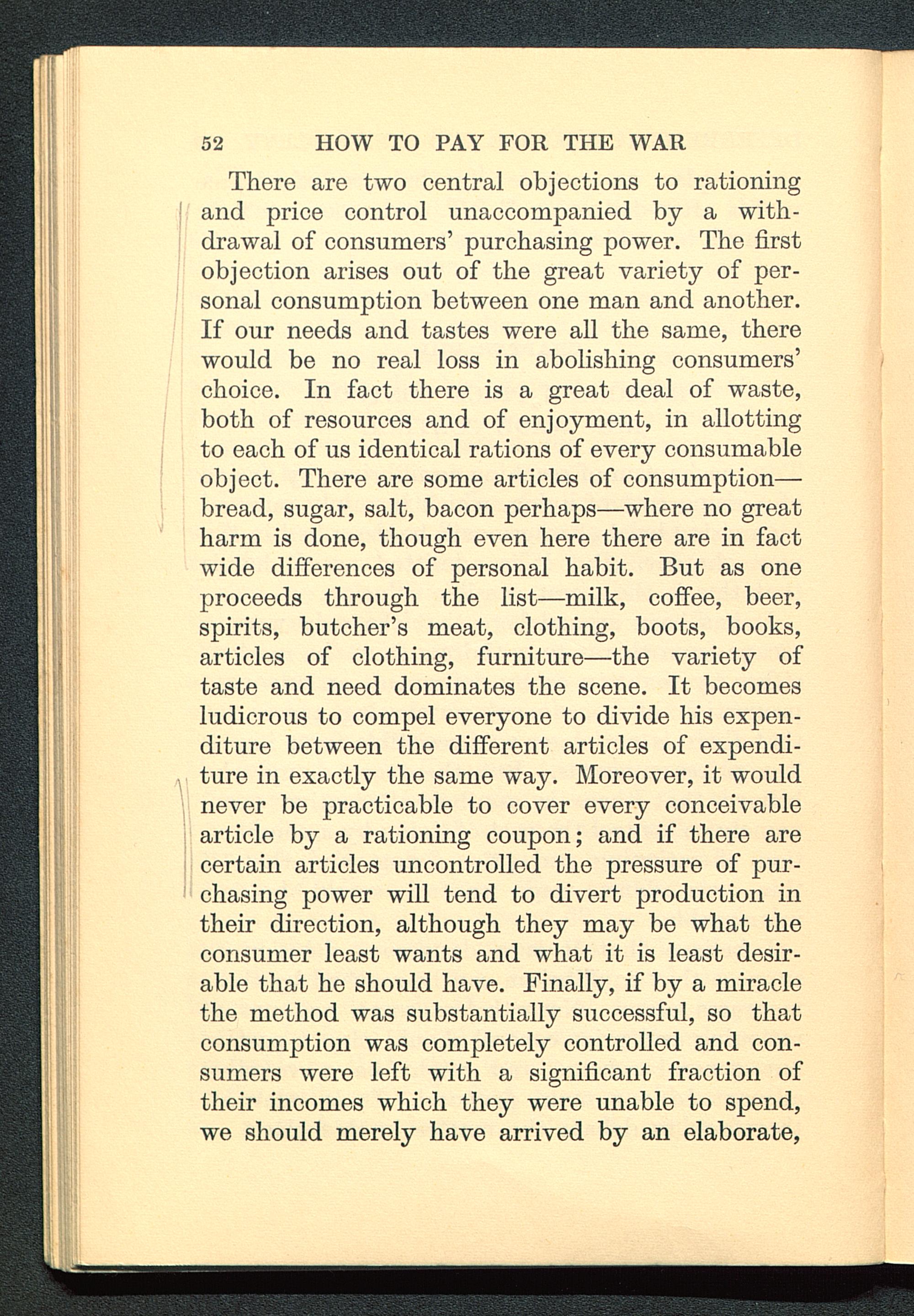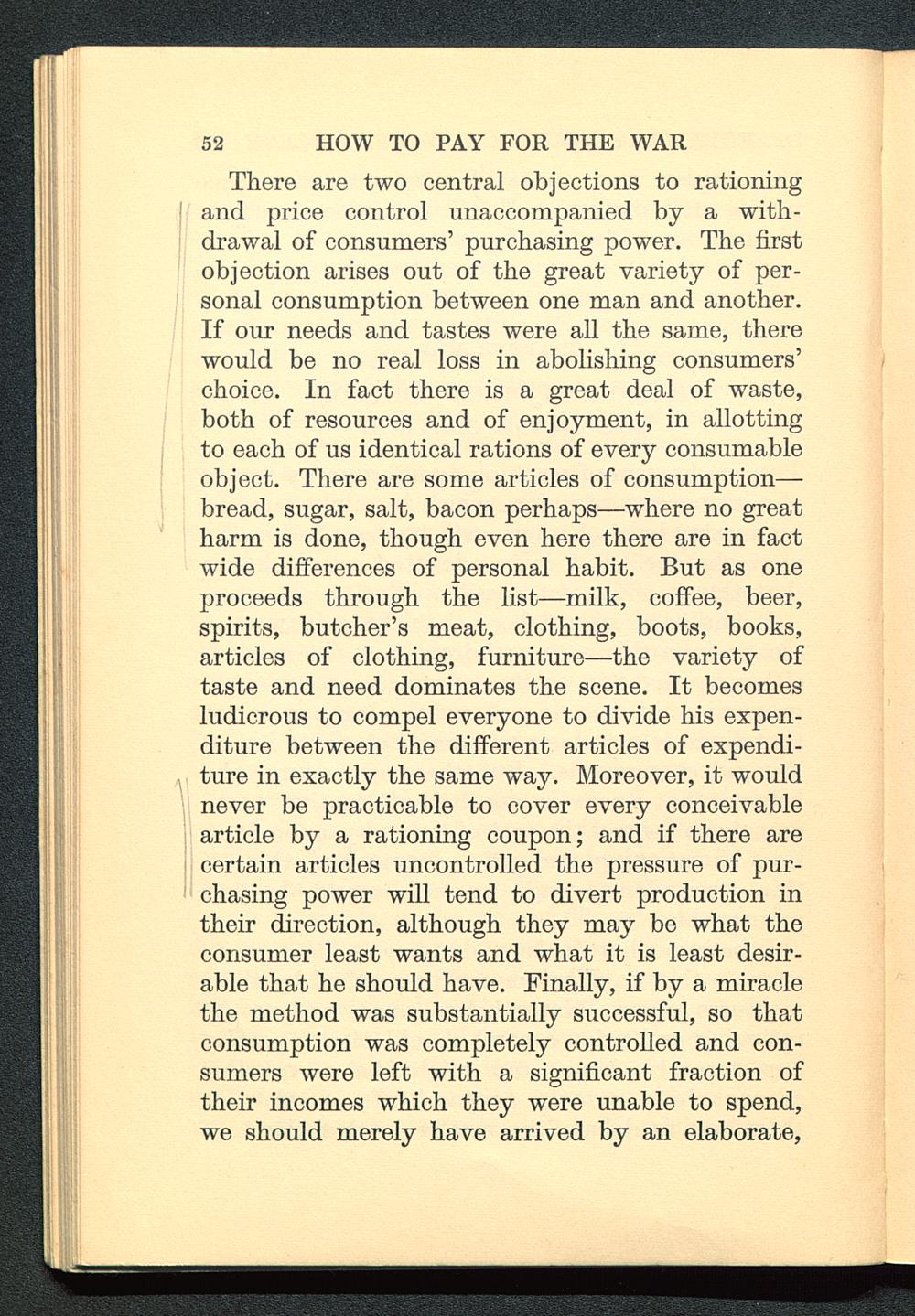 There are two central objections to rationingand price control unaccompanied by a with-drawal of consumers' purchasing power. The firstobjection arises out of the great variety of per-sonal consumption between one man and another.If our needs and tastes were all the same, therewould be no real loss in abolishing consumers'choice. In fact there is a great deal of waste,both of resources and of enjoyment, in allottingto each of us identical rations of every consumableobject. There are some articles of consumption—bread, sugar, salt, bacon perhaps—where no greatharm is done, though even here there are in factwide differences of personal habit. But as oneproceeds through the list—milk, coffee, beer,spirits, butcher's meat, clothing, boots, books,articles of clothing, furniture—the variety oftaste and need dominates the scene. It becomesludicrous to compel everyone to divide his expen-diture between the different articles of expendi-ture in exactly the same way. Moreover, it wouldnever be practicable to cover every conceivablearticle by a rationing coupon; and if there arecertain articles uncontrolled the pressure of pur-chasing power will tend to divert production intheir direction, although they may be what theconsumer least wants and what it is least desir-able that he should have. Finally, if by a miraclethe method was substantially successful, so thatconsumption was completely controlled and con-sumers were left with a significant fraction oftheir incomes which they were unable to spend,we should merely have arrived by an elaborate,