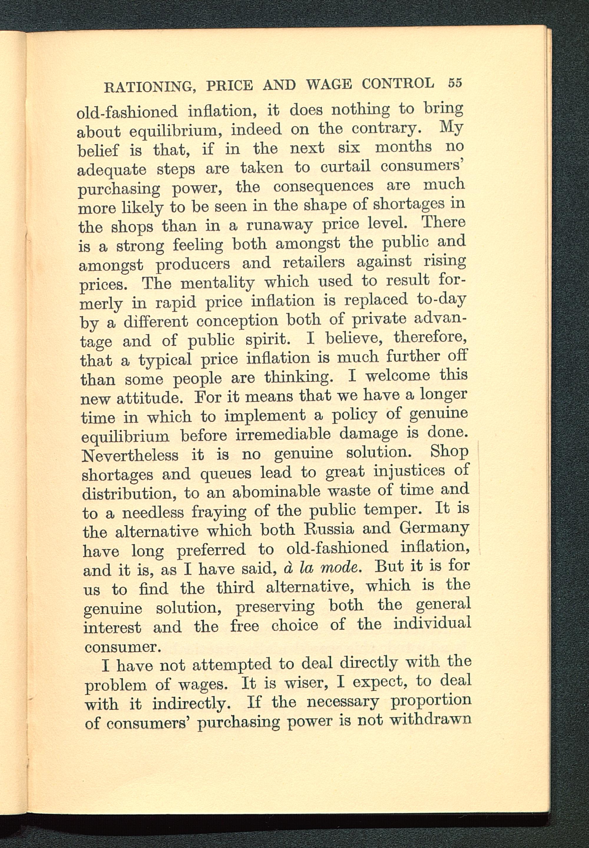 old-fashioned inflation, it does nothing to bringabout equilibrium, indeed on the contrary. Mybelief is that, if in the next six months noadequate steps are taken to curtail consumers'purchasing power, the consequences are muchmore likely to be seen in the shape of shortages inthe shops than in a runaway price level. Thereis a strong feeling both amongst the public andamongst producers and retailers against risingprices. The mentality which used to result for-merly in rapid price inflation is replaced to-dayby a different conception both of private advan-tage and of public spirit. I believe, therefore,that a typical price inflation is much further offthan some people are thinking. I welcome thisnew attitude. For it means that we have a longertime in which to implement a policy of genuineequilibrium before irremediable damage is done.Nevertheless it is no genuine solution. Shopshortages and queues lead to great injustices ofdistribution, to an abominable waste of time andto a needless fraying of the public temper. It isthe alternative which both Russia and Germany have long preferred to old-fashioned inflation,and it is, as I have said, d la mode. But it is forus to find the third alternative, which is thegenuine solution, preserving both the generalinterest and the free choice of the individualconsumer.