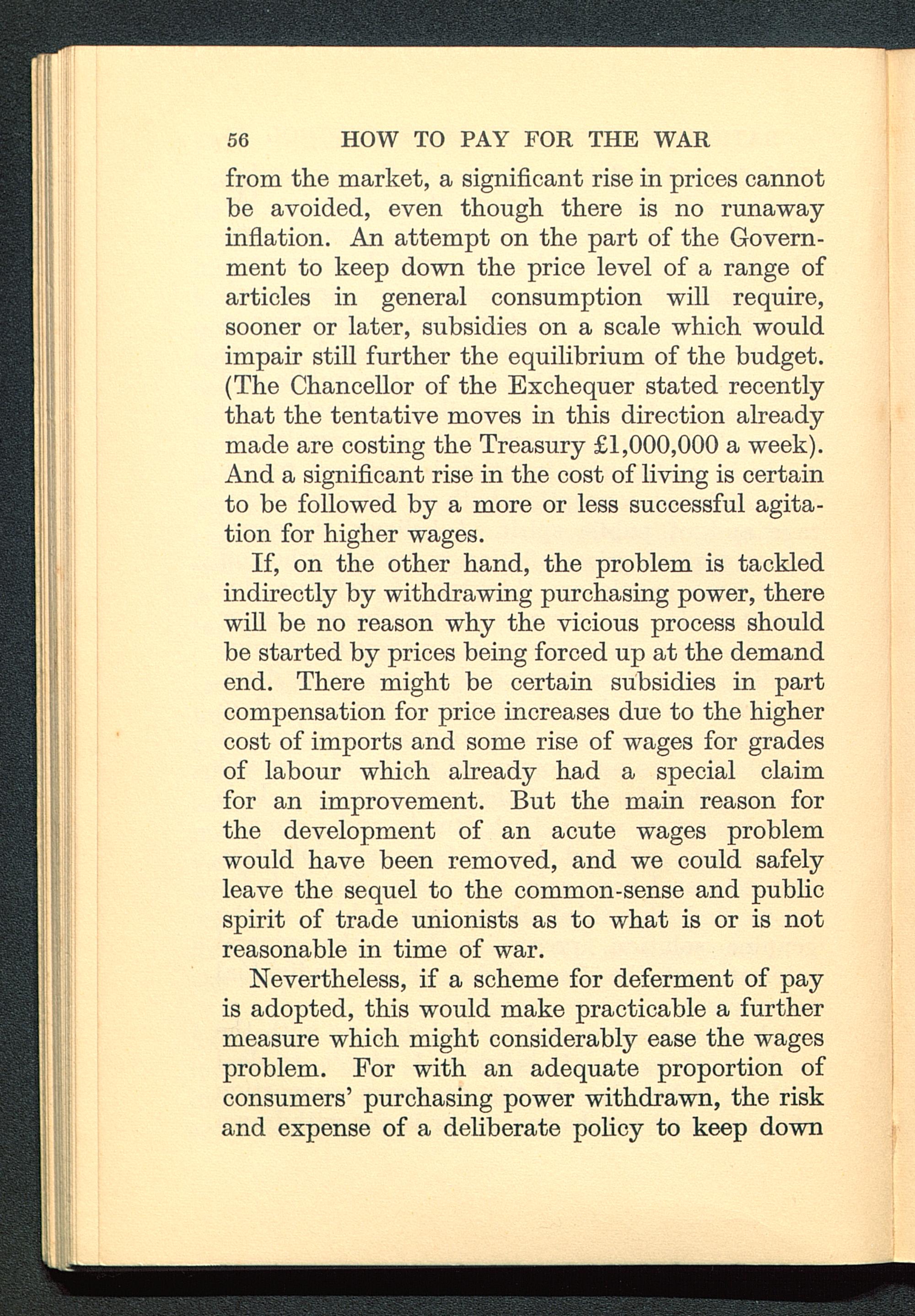 Nevertheless, if a scheme for deferment of payis adopted, this would make practicable a furthermeasure which might considerably ease the wagesproblem. For with an adequate proportion ofconsumers' purchasing power withdrawn, the riskand expense of a deliberate policy to keep down