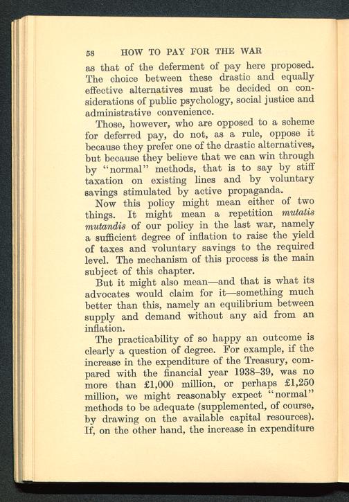 Now this policy might mean either of twothings. It might mean a repetition mutatismutandis of our policy in the last war, namelya sufficient degree of inflation to raise the yieldof taxes and voluntary savings to the requiredlevel. The mechanism of this process is the mainsubject of this chapter.