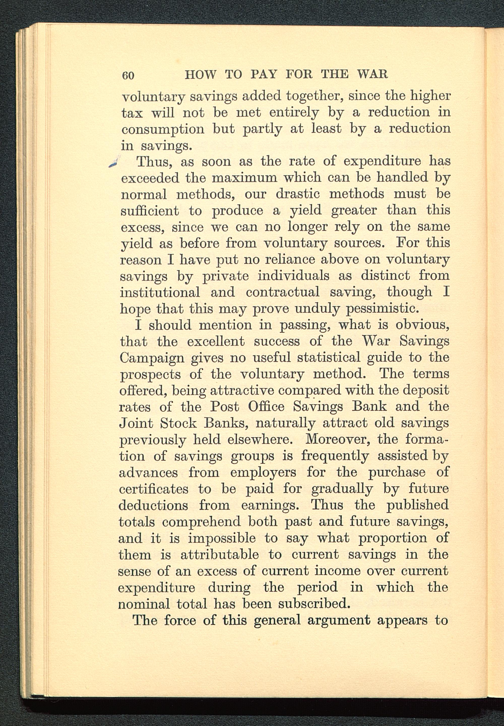 > Thus, as soon as the rate of expenditure hasexceeded the maximum which can be handled bynormal methods, our drastic methods must besufficient to produce a yield greater than thisexcess, since we can no longer rely on the sameyield as before from voluntary sources. For thisreason I have put no reliance above on voluntarysavings by private individuals as distinct frominstitutional and contractual saving, though Ihope that this may prove unduly pessimistic.