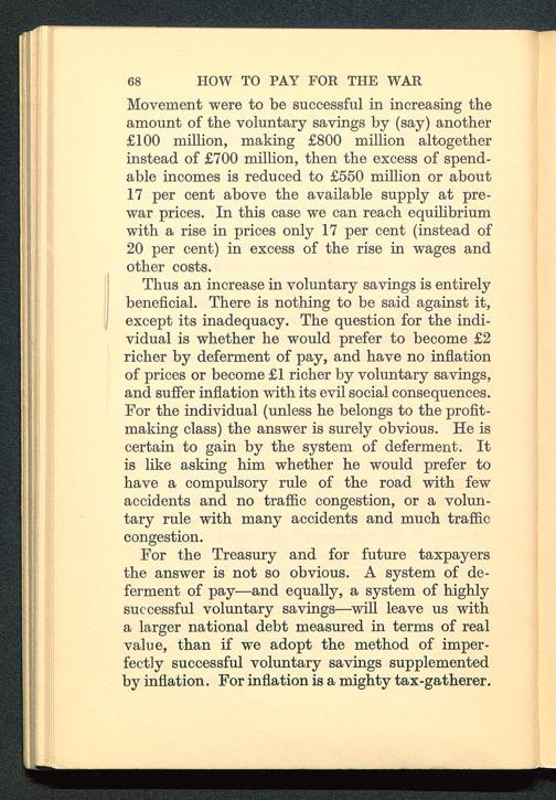 For the Treasury and for future taxpayersthe answer is not so obvious. A system of de-ferment of pay—and equally, a system of highlysuccessful voluntary savings—will leave us witha larger national debt measured in terms of realvalue, than if we adopt the method of imper-fectly successful voluntary savings supplementedby inflation. For inflation is a mighty tax-gatherer.