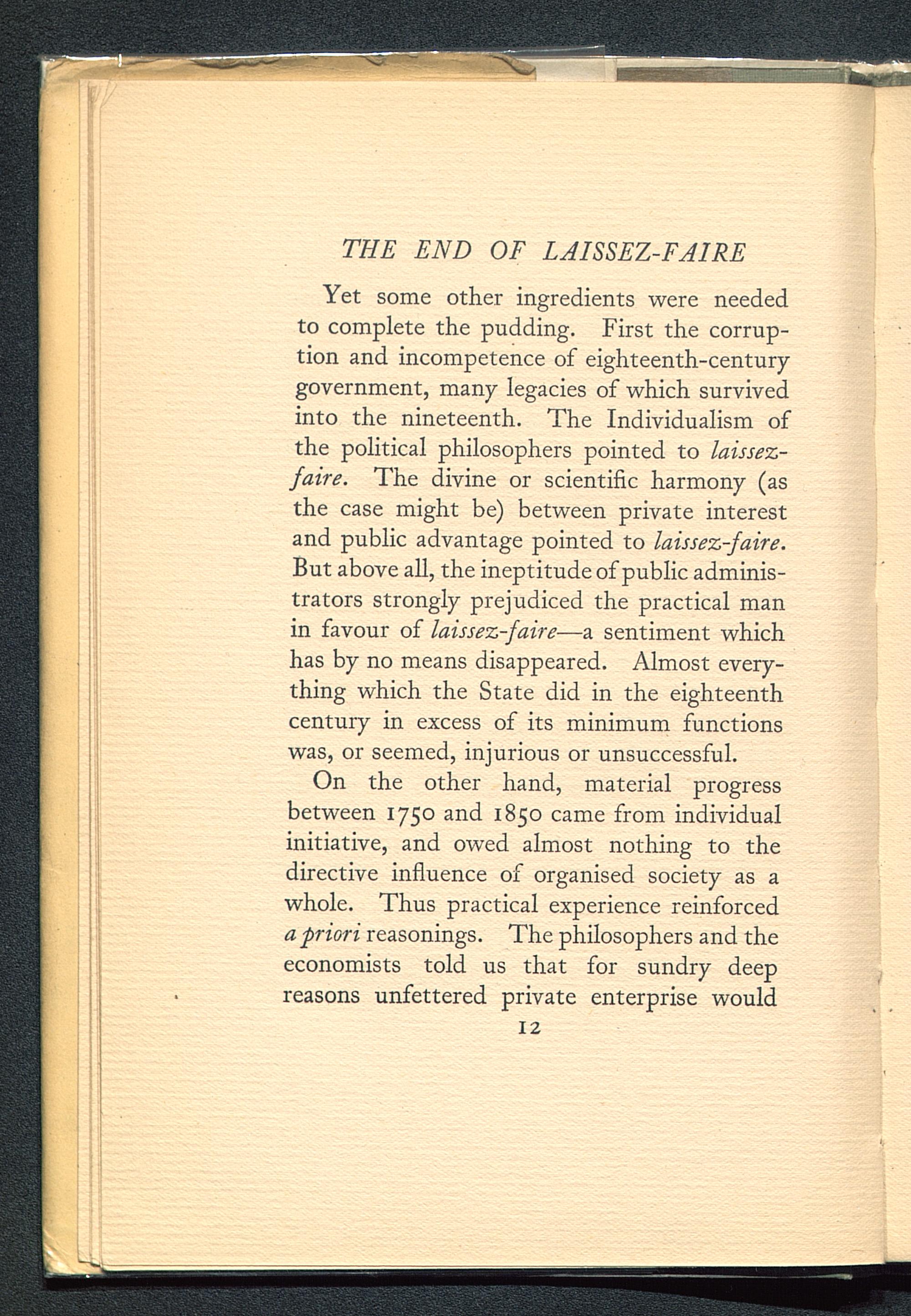 On the other hand, material progressbetween 1750 and 1850 came from individualinitiative, and owed almost nothing to thedirective influence of organised society as awhole. Thus practical experience reinforceda priori reasonings. The philosophers and theeconomists told us that for sundry deepreasons unfettered private enterprise would12