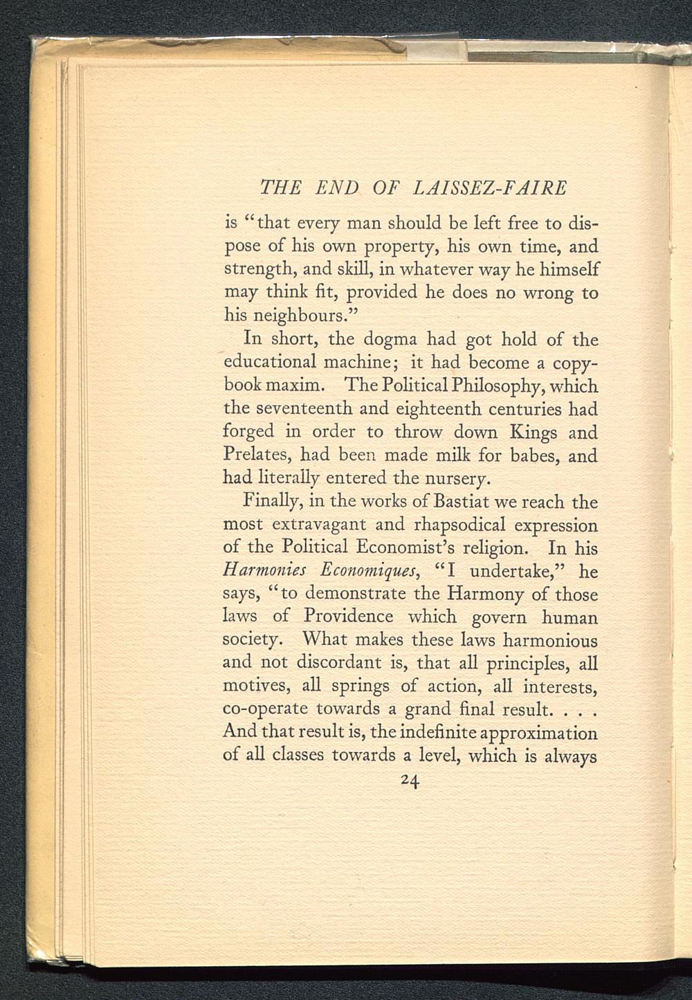 Finally, in the works of Bastiat we reach themost extravagant and rhapsodical expressionof the Political Economist ’s religion. In hisHarmonies Economiques, “I undertake,” hesays, “to demonstrate the Harmony of thoselaws of Providence which govern humansociety. What makes these laws harmoniousand not discordant is, that all principles, allmotives, all springs of action, all interests,co-operate towards a grand final result. . . .And that result is, the indefinite approximationof all classes towards a level, which is always24