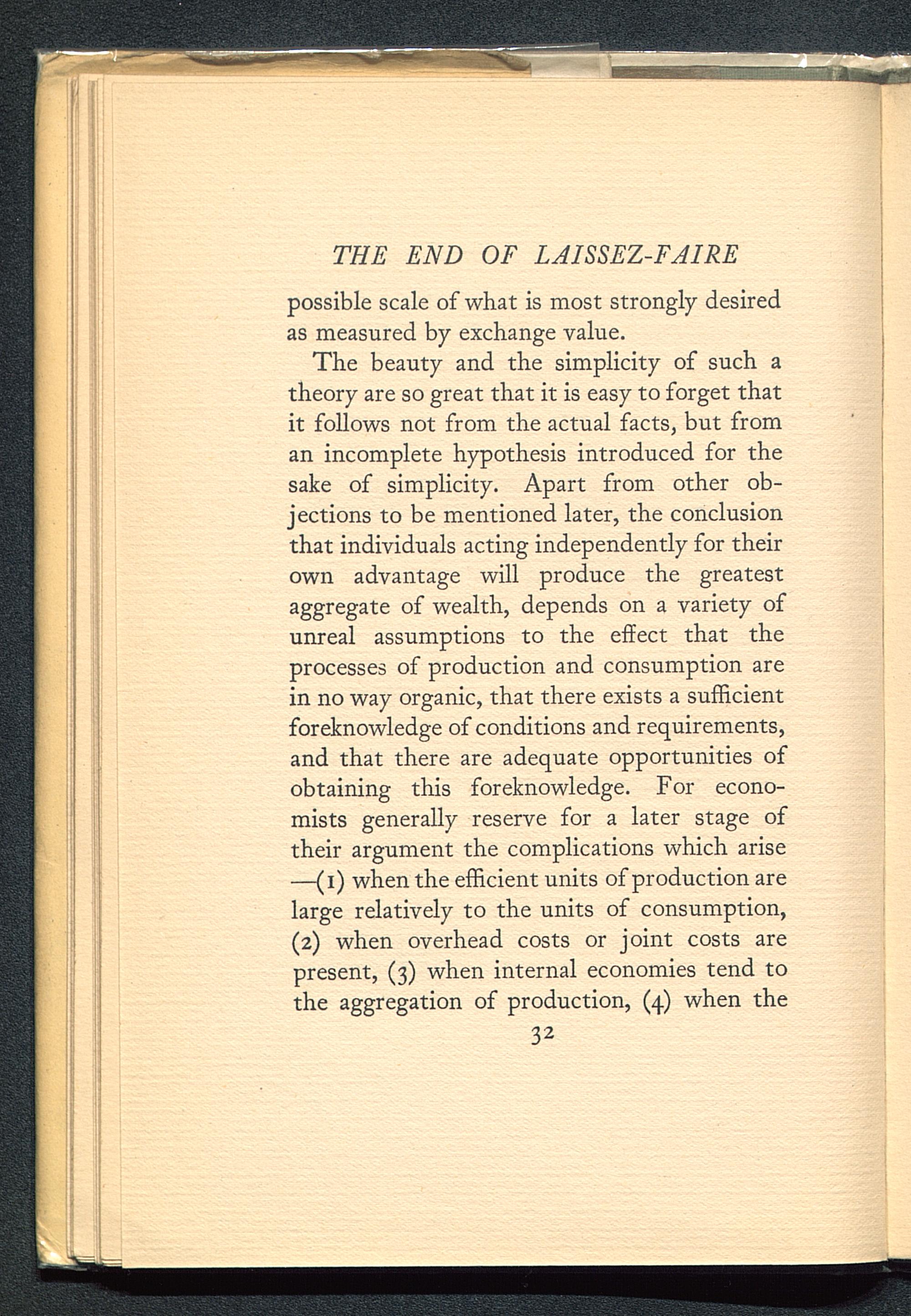 The beauty and the simplicity of such atheory are so great that it is easy to forget thatit follows not from the actual facts, but froman incomplete hypothesis introduced for thesake of simplicity. Apart from other ob-jections to be mentioned later, the conclusionthat individuals acting independently for theirown advantage will produce the greatestaggregate of wealth, depends on a variety ofunreal assumptions to the effect that theprocesses of production and consumption arein no way organic, that there exists a sufficientforeknowledge of conditions and requirements,and that there are adequate opportunities ofobtaining this foreknowledge. For econo-mists generally reserve for a later stage oftheir argument the complications which arise—(i) when the efficient units of production arelarge relatively to the units of consumption,(2) when overhead costs or joint costs arepresent, (3) when internal economies tend tothe aggregation of production, (4) when the