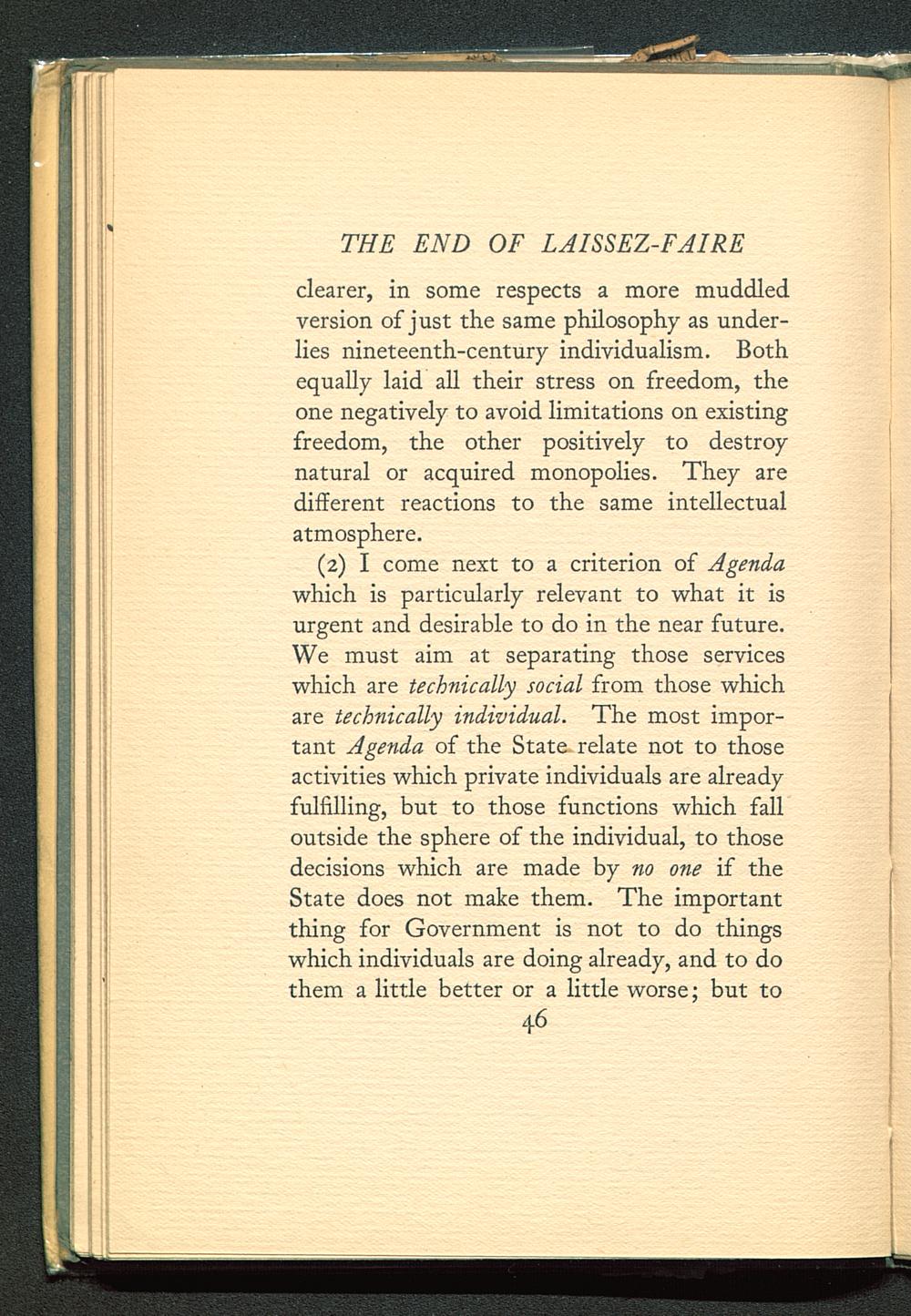 (2) I come next to a criterion of Agendawhich is particularly relevant to what it isurgent and desirable to do in the near future.We must aim at separating those serviceswhich are technically social from those whichare technically individual. The most impor-tant Agenda of the State relate not to thoseactivities which private individuals are alreadyfulfilling, but to those functions which falloutside the sphere of the individual, to thosedecisions which are made by no one if theState does not make them. The importantthing for Government is not to do thingswhich individuals are doing already, and to dothem a little better or a little worse; but to46