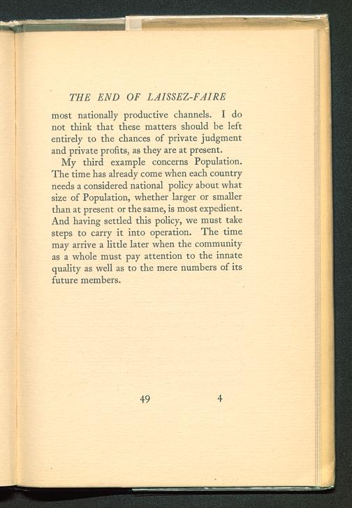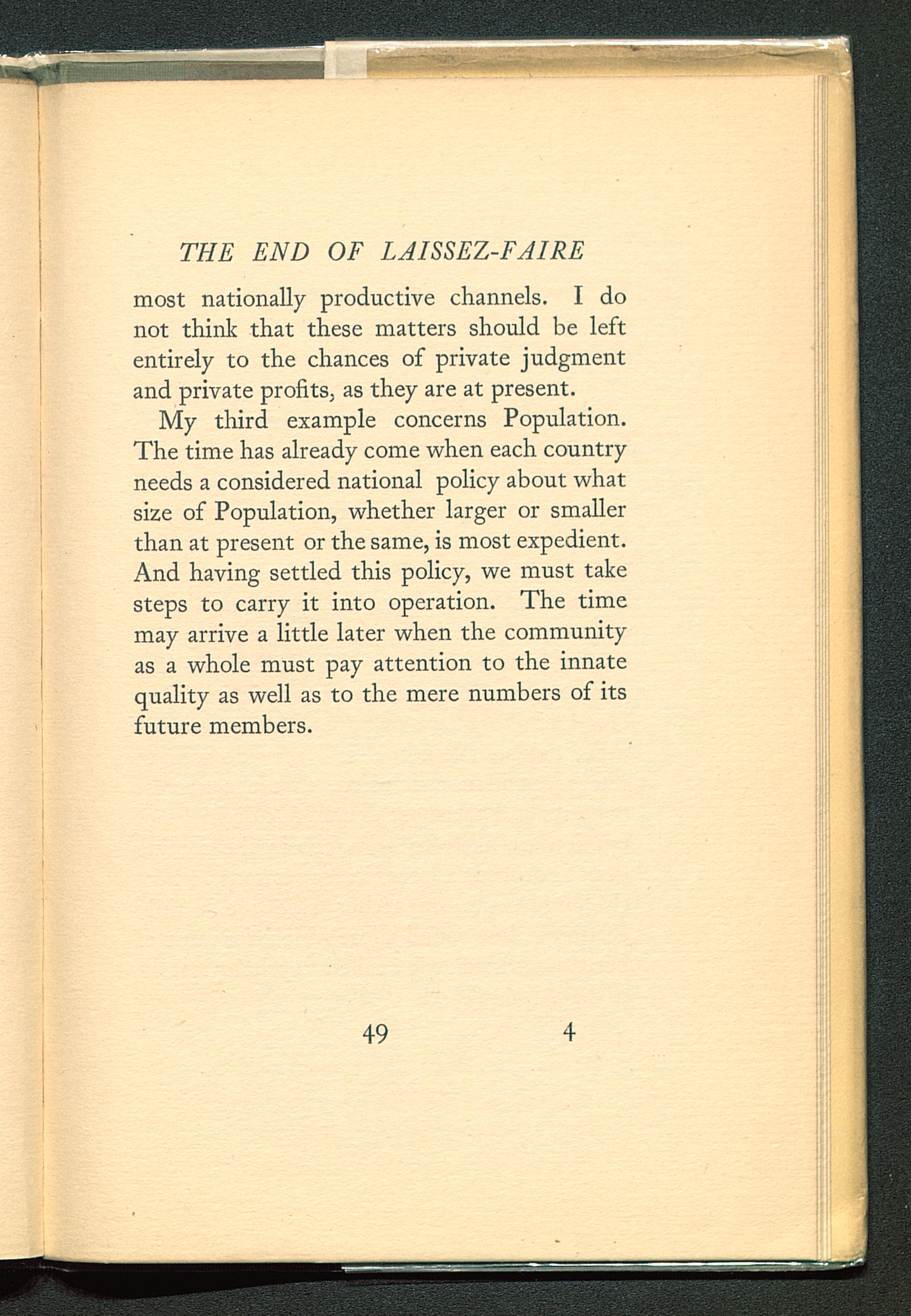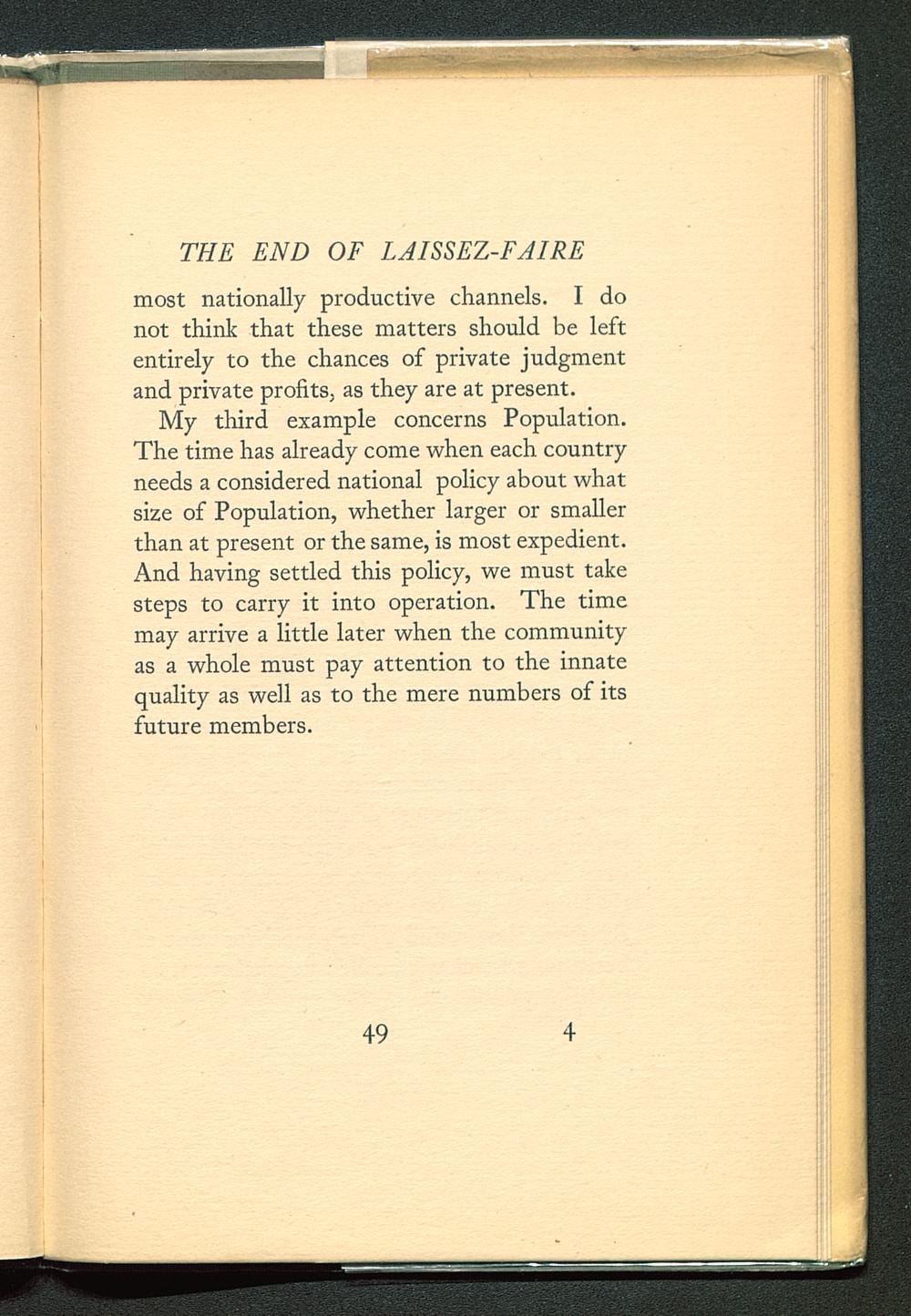 My third example concerns Population.The time has already come when each countryneeds a considered national policy about whatsize of Population, whether larger or smallerthan at present or the same, is most expedient.And having settled this policy, we must takesteps to carry it into operation. The timemay arrive a little later when the communityas a whole must pay attention to the innatequality as well as to the mere numbers of itsfuture members.