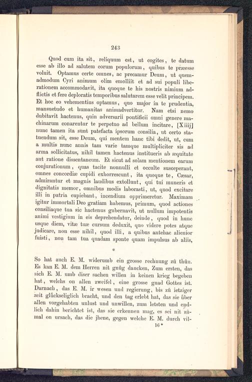 Quod cum ita sit, reliquum est, ub cogibos , be datnmesse ab illo ad salubem eorura populorum, quibus be pncessevoluib. Opbamus cerbe oumes, ac preeamur Deum, nb quem-admodum Cyri animum olim emolliib eb ad sui populi libe-rabionem accomraodavib, iba quoque be Iiis nosbris nimium ad-fiicbis eb fere deplorabis bemporibus salubarem esse velib principem.Eb hoc eo veliemenbius opbamus, quo major in be prudeubia,mansuebudo eb humanibas animadverbibur. Nam ebsi nemodubibavib liacbenus, quin adversarii ponbificii omni geuere ma-chinarum conarenbur be perpebuo ad bellum incibare, [Xiiij]nunc bamen iba sunb pabefacba ipsorum cousilia, ub cerbo sba-buendum sit, esse Deum, qui menbem haue bibi dedib, ub, cuma mulbis nunc annis bam varie bamque mulbiplieiber sis adarma sollicibabus, nihil bamen liacbenus insbibueris ab asquibabeaub rabione dissenbaueum. Eb sieub ad solam menbiouem earumconjurabionum, quas tacite nonnulli eb occulbe suseeperaub,omnes concordia? cupidi exhorrescunt, ita quoque te, Caesar,admiraubur eb magnis laudibus exbolluub, qui bui muneris ebdiguibabis memor, omnibus modis laborasbi, ub, quod excibareilli in pabria cupiebanb, incendium opprimeretor. Maximamigibur immorbali Deo grabiam habemus, primum, quod aebionesconsiliaque bua sie liacbenus gubernavib, ub nulluni impobenbisanimi vesbigium in eis depreliendabur, deinde , quod in liuncusque diem, viba? bua? cursum deduxib, quo videre pobes atquejudicarc, non esse nihil, quod illi, a quibus anbehac alieniorfuisbi, non bam bua quadam sponbe quam impulsus ab aliis,
