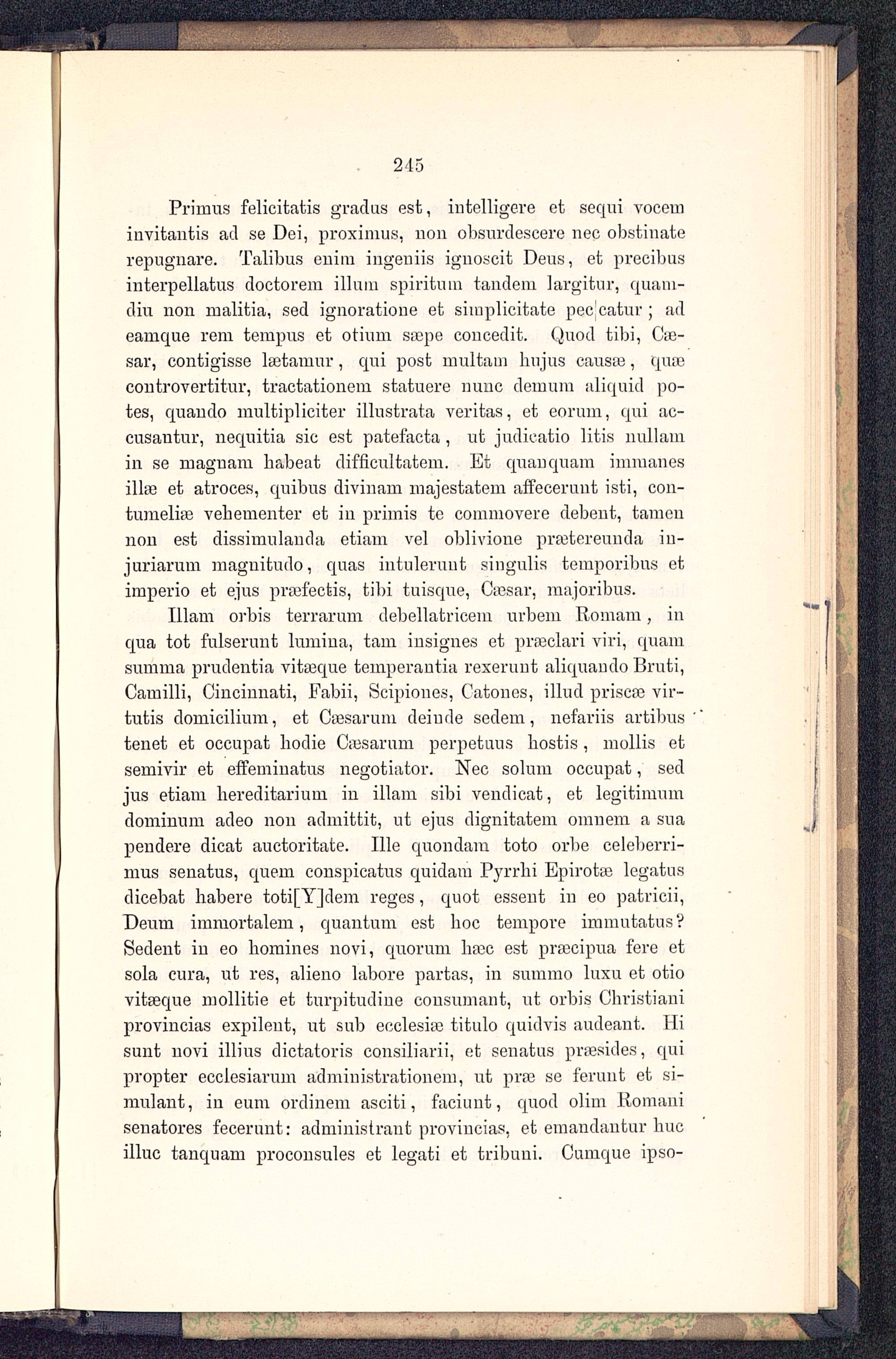 Primus felicitatis gradus est, intelligere et sequi voceminvitautis ad se Dei, proximus, uon obsurdescere nec obstinaterepugnare. Talibus euim ingeniis ignoscit Deus, et preeihusinterpellatus doetorem illum spiritum tandem largitur, quani-diu non malitia, sed ignoratione et simplicitate pec'catur ; adeamque rem tempus et otium saspe concedit. Quod tibi, Cae-sar, contigisse laitamur, epri post multam hujus causa?, qua?contrövertitur, tractationem statuere nunc demum aliquid po-tes, epiando mnltipliciter illustrata veritas, et eorum, qui ae-cusantur, neepütia sie est patefacta, ut judicatio litis nullamin se maguam habeat difficultatem. Et quanquam immanesilla? et atroces, qnibus divinam majestatem affecerunt isti, con-fcumelise vehementer et in primis te commovere debent, tarnennon est dissimulanda etiam vel oblivione prastereunda iu-juriarum magnitudo, qnas intuleruut singulis temporibus etimperio et ejus prsefectis, tibi toisque, CaBsar, majoribus.