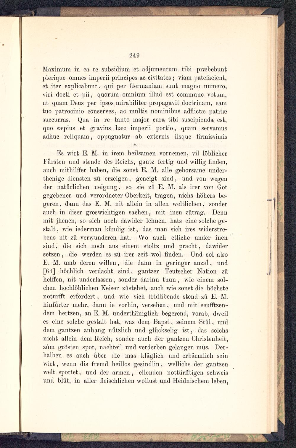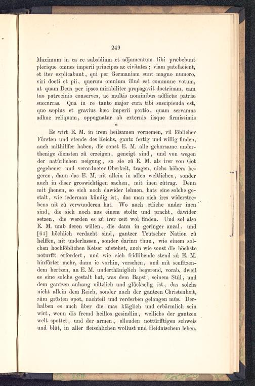 Es wirt E. M. in irem beilsamen vornemen, vil löblicherFürsten und stende des Reichs, gantz fertig und willig linden,auch mithilffer haben, die sonst E. M. alle gehorsame under-thenige diensten zü erzeigen, geneigt sind , und von wegender natürlichen neiguug, so sie zü E. M. als irer von Gotgegebener und verordneter Oberkeit, tragen, nichs höhers be-geren, dann das E. M. nit allein in allen weltlichen, sonderauch in diser groswichtigen sachen, mit inen zütrag. Dennmit jhenen, so sich noch dawider lehnen, hats eine solche ge-stalt, wie iederman kundig ist, das man sich ires widerstre-bens nit zü verwunderen hat. Wo auch etliche under inensind, die sich noch aus einem stoltz und praebt, dawidersetzen, die werden es zü irer zeit wol finden. Und sol alsoE. M. umb deren willen, die dann in geringer anzal, und[Gl] höchlich verdacht sind, gantzer Teutscher Nation zühelffen, nit underlassen, sonder darinu thuu, wie einem sol-chen hochlöblichen Keiser züstehet, auch wie sonst die höchstenoturfft erfordert, und wie sich fridlibende steud zü E. M.hinfürter mehr, dann ie vorhin, versehen, und mit seufftzen-dem hertzen, an E. M. underthäniglich begerend, vorab, dweiles eine solche gestalt bat, was dem Bapst, seinem Stül, unddem gantzen anhang nützlich und gluckselig ist, das solchsnicht allein dem Reich, sonder auch der gantzen Christenheit,zum grösten spot, nachteil und verderben gelangen müs. Der-halben es auch über die mas kläglich und erbärmlich seinwirt, wenn dis fremd heillos gesindlin, wellichs der gantzenweit spottet, und der armen , eilenden nottürfftigen Schweisund blüt, in aller fleischlichen wollust und Heidnischem leben,