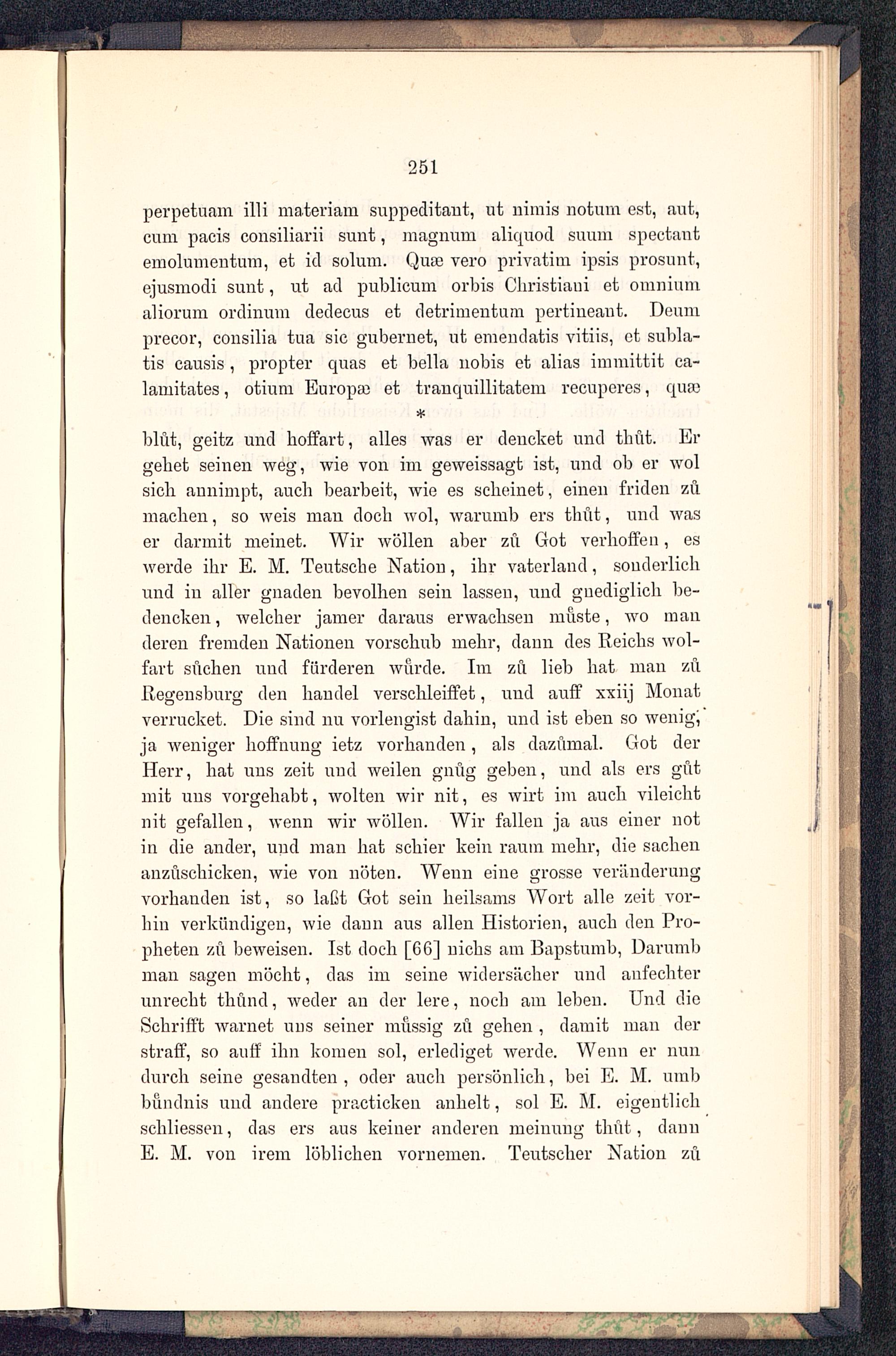 blüt, geitz und hoffart, alles Avas er dencket und tbüt. Ergebet seinen weg, wie von im geweissagt ist, und ob er wolsieb annimpt, auch bearbeit, wie es scheinet, einen friden zumachen, so weis man doch wol, warumb ers thüt, und waser darmit meinet. Wir wollen aber zu Got verhoffen, eswerde ihr E. M. Teutsche Nation, ihr Vaterland, sonderlichund in aller gnaden bevolhen sein lassen, und guediglich be-dencken, welcher jamer daraus erwachsen mfiste, wo manderen fremden Nationen Vorschub mehr, dann des Reichs wol-fart suchen und förderen wurde. Im zu lieb hat man zu.Regensburg den handel verschleiffet, und auff xxiij Monatverrucket. Die sind nu vorlengist dahin, und ist eben so wenig,ja weniger hoffnung ietz vorhanden, als dazumal. Got derHerr, hat uns zeit und weilen gnüg geben, und als ers gutmit uns vorgehabt, wolten wir nit, es wirt im auch vileichtnit gefallen, wenn wir wollen. Wir fallen ja aus einer notin die ander, und man bat schier kein räum mehr, die Sachenanzuschicken, wie von nöten. Wenn eine grosse Veränderungvorhanden ist, so laßt Got sein heilsams Wort alle zeit vor-hin verkündigen, wie dann aus allen Historien, auch den Pro-pheten zu beweisen. Ist doch [66] nichs am Bapstumb, Darumbman sagen möcht, das im seine Widersacher und anfechterunrecht thünd, weder an der lere, noch am leben. Und dieSchrifft warnet uns seiner müssie zu sehen damit man der