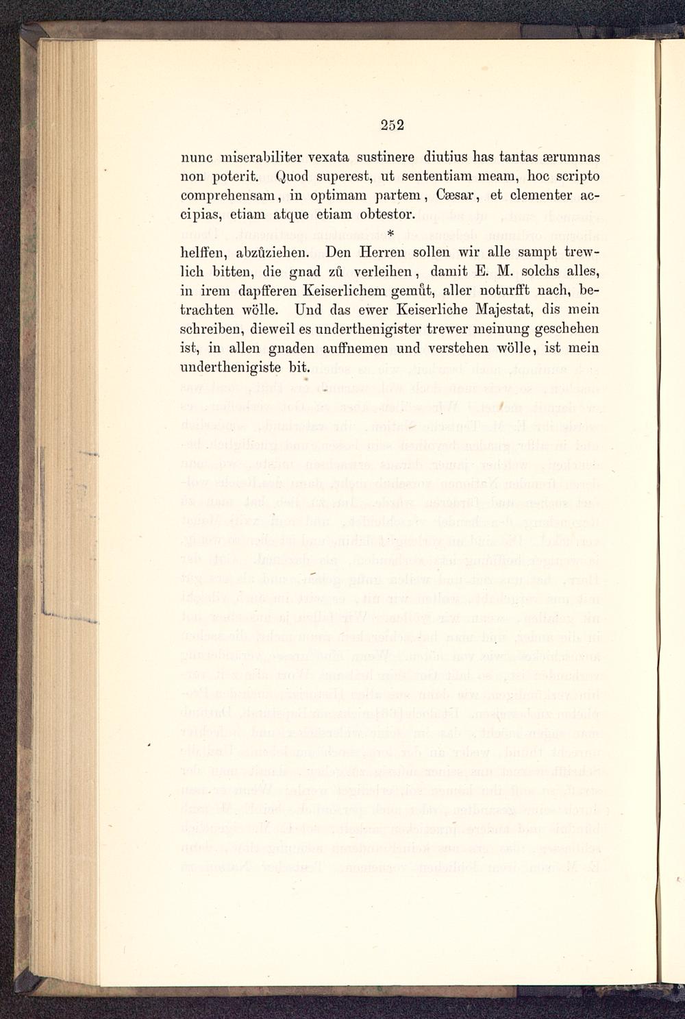 helffen, abzüziehen. Den Herren sollen wir alle sampt trew-lich bitten, die gnad zu verleiben, damit E. M. solclis alles,in irem dapfferen Keiserlicbem gemfit, aller noturfft nach, be-tracbten wolle. Und das ewer Keiserliche Majestät, dis meinschreiben, dieweil es underthenigister trewer meinung geschehenist, in allen gnaden auffnemen und verstehen wolle, ist meinunderthenigiste bit.