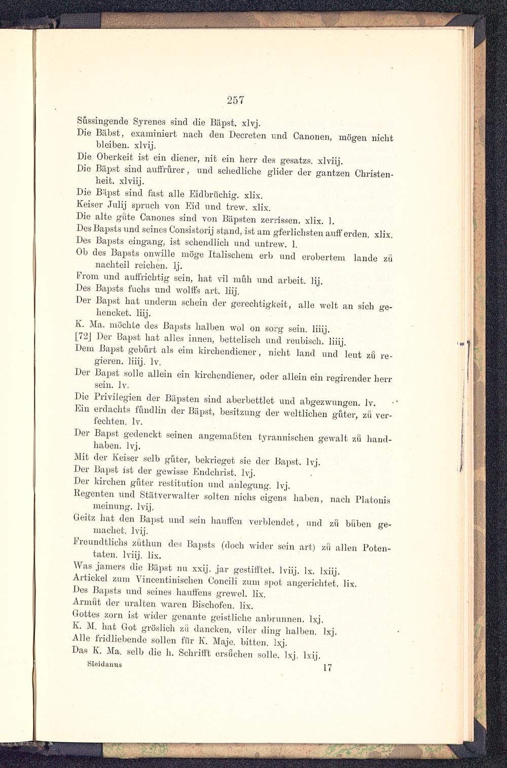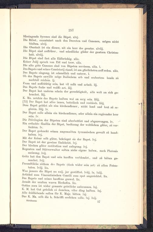 Die Oberkeit ist ein diener, nit ein heiT des gesatzs. xlviij.Die Bäpst sind auffrürer , und schedliche glider der gantzen Christen-heit, xlviij.Die Bäpst sind fast alle Eidbrüchig, xlix.Keiser Juljj Spruch von Eid und trew. xlix.Die alte gute Canones sind von Bäpsten zerrissen, xlix. 1.Des Bapsts und seines Consistorij stand, ist am gferlichsten auft'erden, xlix.Des Bapsts eingang, ist schendlich und untrew. 1.