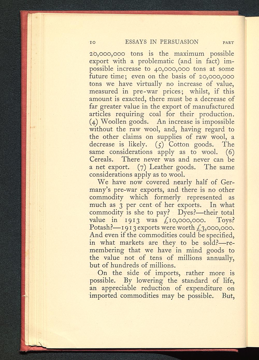 20,000,000 tons is the maximum possibleexport with a problematic (and in fact) im-possible increase to 40,000,000 tons at somefuture time; even on the basis of 20,000,000tons we have virtually no increase of value,measured in pre-war prices; whilst, if thisamount is exacted, there must be a decrease offar greater value in the export of manufacturedarticles requiring coal for their production.(4) Woollen goods. An increase is impossiblewithout the raw wool, and, having regard tothe other claims on supplies of raw wool, adecrease is likely. (5) Cotton goods. Thesame considerations apply as to wool. (6)Cereals. There never was and never can bea net export. (7) Leather goods. The sameconsiderations apply as to wool.