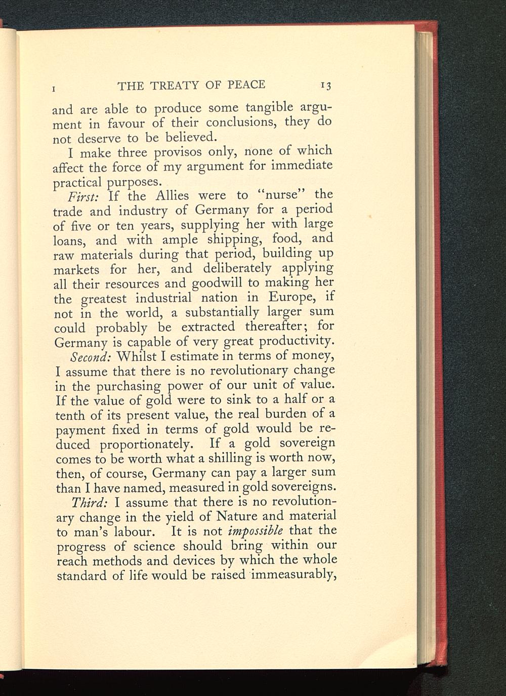 Second: Whilst I estimate in terms of money,I assume that there is no revolutionary changein the purchasing power of our unit of value.If the value of gold were to sink to a half or atenth of its present value, the real burden of apayment fixed in terms of gold would be re-duced proportionately. If a gold sovereigncomes to be worth what a shilling is worth now,then, of course, Germany can pay a larger sumthan I have named, measured in gold sovereigns.