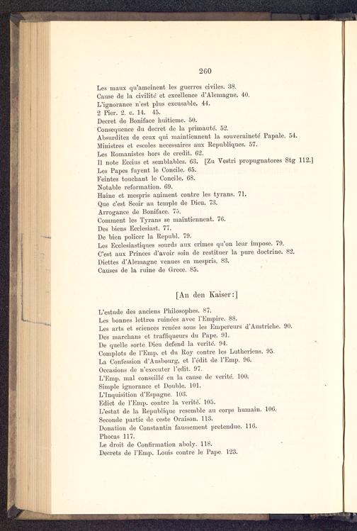 Les Ecclesiastiques sourds aux crimes qu'on lenr impose. 79.C'est aux Princes d'avoir soin de restituer la pure doctrine. 82.Diettes d'Alemagne venues en mespris. 83.Causes de la ruine de Grece . 85.