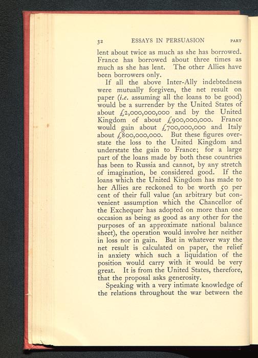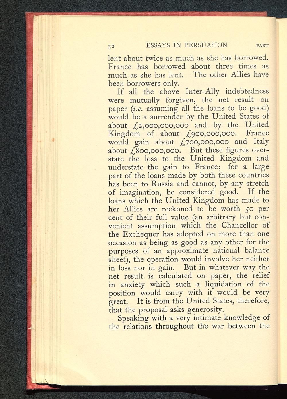 If all the above Inter-Ally indebtednesswere mutually forgiven, the net result onpaper ( i.e . assuming all the loans to be good)would be a surrender by the United States ofabout £2,000,000,000 and by the UnitedKingdom of about £900,000,000. France would gain about £700,000,000 and Italy about £800,000,000. But these figures over-state the loss to the United Kingdom andunderstate the gain to France ; for a largepart of the loans made by both these countrieshas been to Russia and cannot, by any stretchof imagination, be considered good. If theloans which the United Kingdom has made toher Allies are reckoned to be worth 50 percent of their full value (an arbitrary but con-venient assumption which the Chancellor ofthe Exchequer has adopted on more than oneoccasion as being as good as any other for thepurposes of an approximate national balancesheet), the operation would involve her neitherin loss nor in gain. But in whatever way thenet result is calculated on paper, the reliefin anxiety which such a liquidation of theposition would carry with it would be verygreat. It is from the United States , therefore,that the proposal asks generosity.