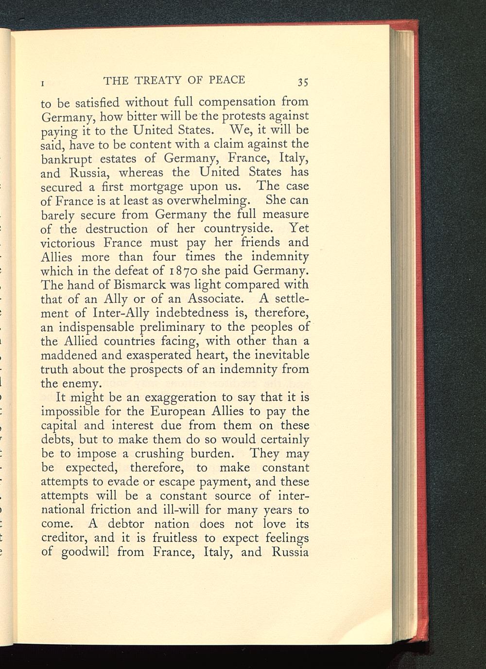 to be satisfied without full compensation fromGermany , how bitter will be the protests againstpaying it to the United States . We, it will besaid, have to be content with a claim against thebankrupt estates of Germany, France, Italy ,and Russia, whereas the United States hassecured a first mortgage upon us. The caseof France is at least as overwhelming. She canbarely secure from Germany the full measureof the destruction of her countryside. Yetvictorious France must pay her friends andAllies more than four times the indemnitywhich in the defeat of 1870 she paid Germany .The hand of Bismarck was light compared withthat of an Ally or of an Associate. A settle-ment of Inter-Ally indebtedness is, therefore,an indispensable preliminary to the peoples ofthe Allied countries facing, with other than amaddened and exasperated heart, the inevitabletruth about the prospects of an indemnity fromthe enemy.