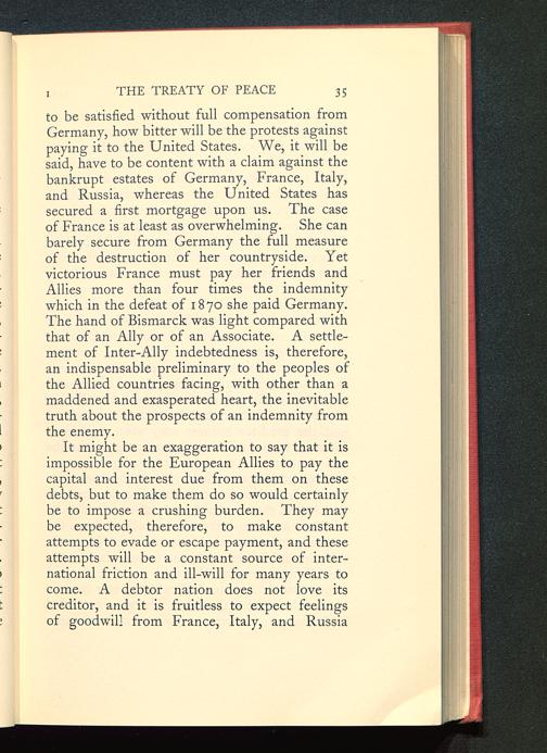 It might be an exaggeration to say that it isimpossible for the European Allies to pay thecapital and interest due from them on thesedebts, but to make them do so would certainlybe to impose a crushing burden. They maybe expected, therefore, to make constantattempts to evade or escape payment, and theseattempts will be a constant source of inter-national friction and ill-will for many years tocome. A debtor nation does not love itscreditor, and it is fruitless to expect feelingsof goodwill from France, Italy, and Russia