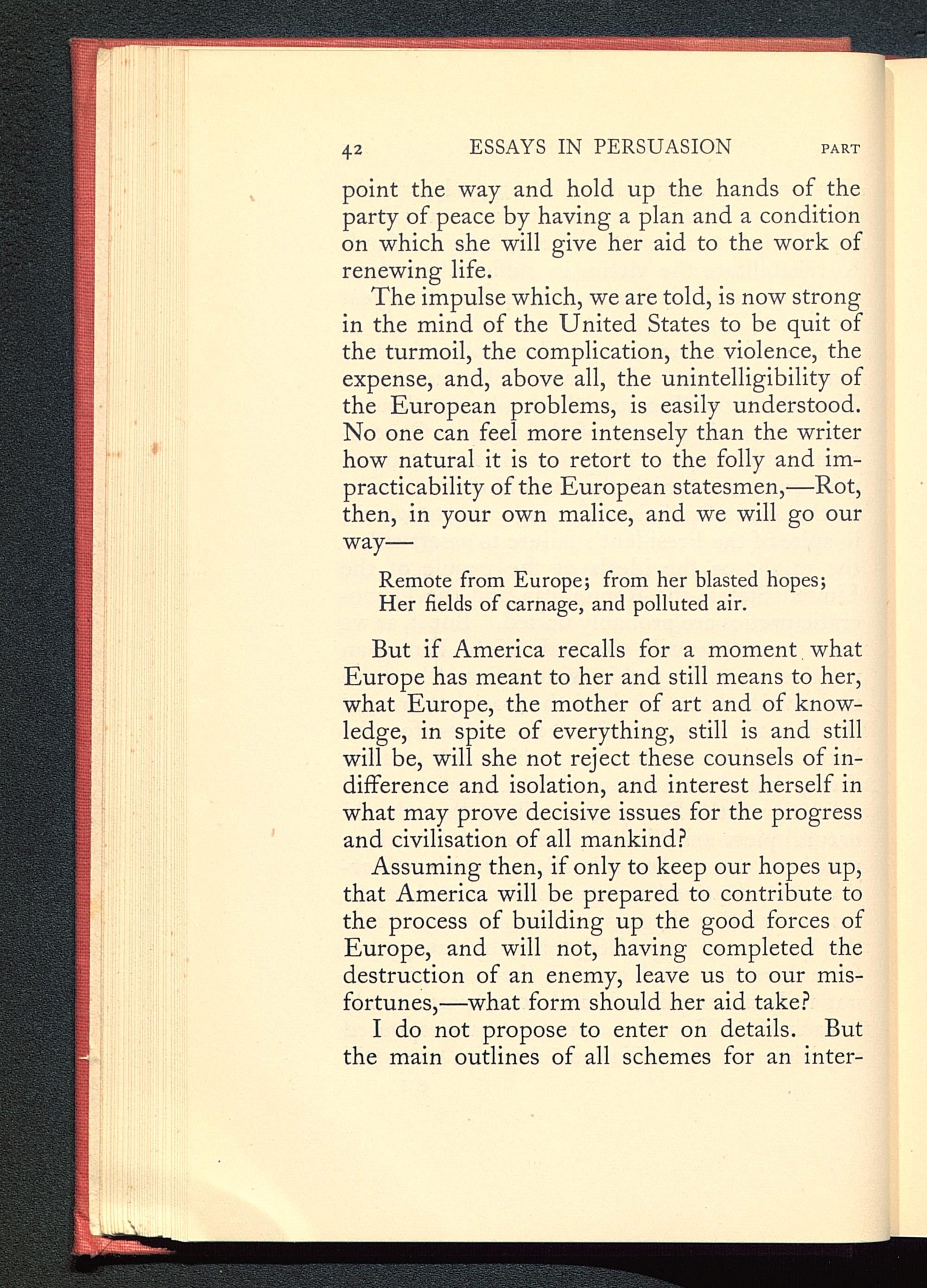 But if America recalls for a moment whatEurope has meant to her and still means to her,what Europe , the mother of art and of know-ledge, in spite of everything, still is and stillwill be, will she not reject these counsels of in-difference and isolation, and interest herself inwhat may prove decisive issues for the progressand civilisation of all mankind?