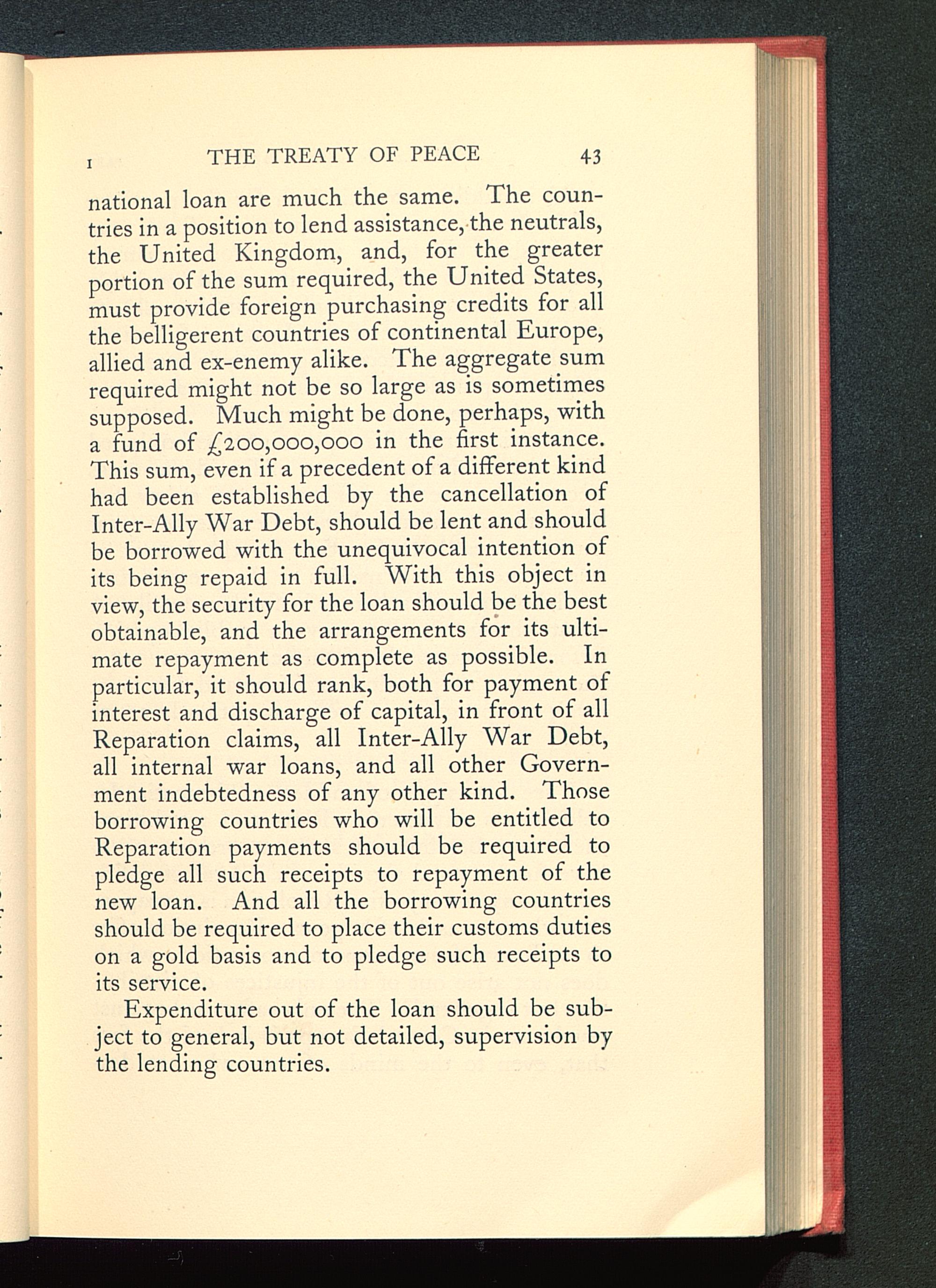 national loan are much the same. The coun-tries in a position to lend assistance, the neutrals,the United Kingdom , and, for the greaterportion of the sum required, the United States ,must provide foreign purchasing credits for allthe belligerent countries of continental Europe,allied and ex-enemy alike. The aggregate sumrequired might not be so large as is sometimessupposed. Much might be done, perhaps, witha fund of £200,000,000 in the first instance.This sum, even if a precedent of a different kindhad been established by the cancellation ofInter-Ally War Debt, should be lent and shouldbe borrowed with the unequivocal intention ofits being repaid in full. With this object inview, the security for the loan should be the bestobtainable, and the arrangements for its ulti-mate repayment as complete as possible. Inparticular, it should rank, both for payment ofinterest and discharge of capital, in front of allReparation claims, all Inter-Ally War Debt,all internal war loans, and all other Govern-ment indebtedness of any other kind. Thoseborrowing countries who will be entitled toReparation payments should be required topledge all such receipts to repayment of thenew loan. And all the borrowing countriesshould be required to place their customs dutieson a gold basis and to pledge such receipts toits service.