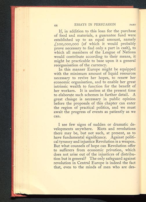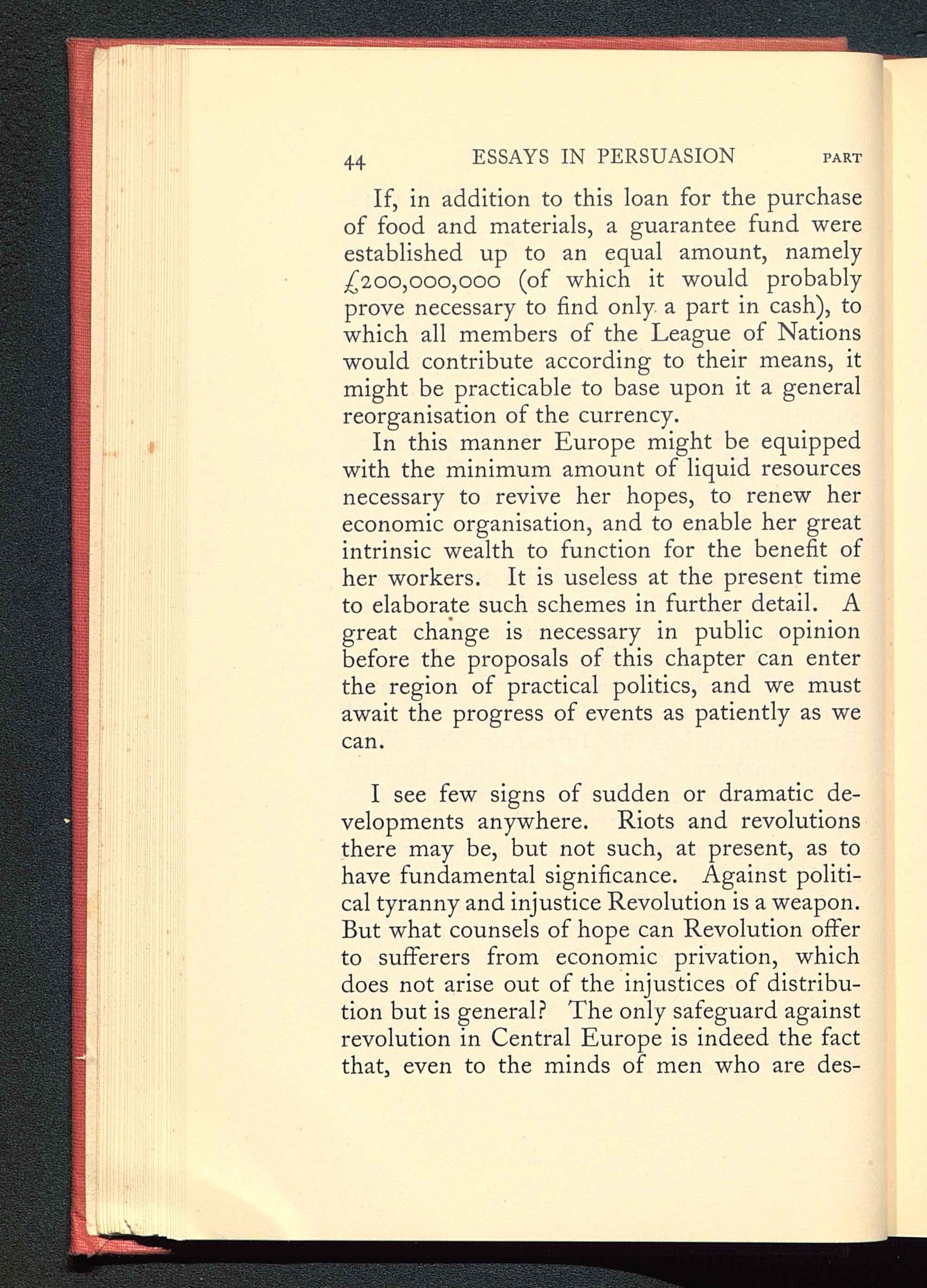 In this manner Europe might be equippedwith the minimum amount of liquid resourcesnecessary to revive her hopes, to renew hereconomic organisation, and to enable her greatintrinsic wealth to function for the benefit ofher workers. It is useless at the present timeto elaborate such schemes in further detail. Agreat change is necessary in public opinionbefore the proposals of this chapter can enterthe region of practical politics, and we mustawait the progress of events as patiently as wecan.