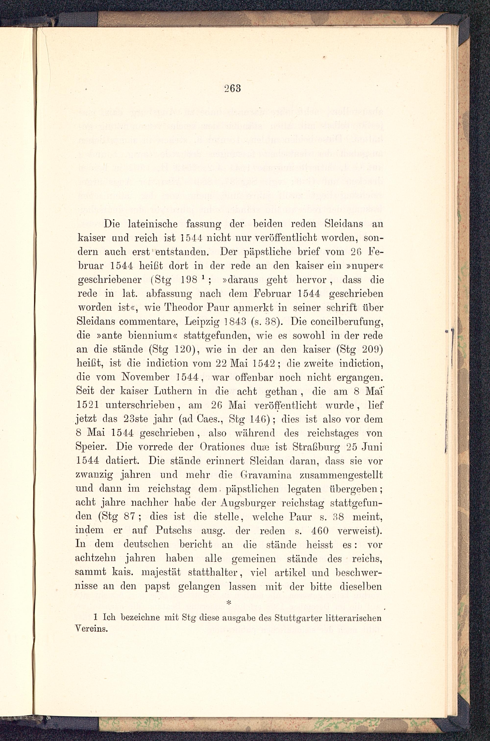 worden ist«, wie Theodor Paur anmerkt in seiner schrift überSleidans commentare, Leipzig 1843 (s. 38). Die concilberufung,die »ante biennium« stattgefunden, wie es sowohl in der redean die stände (Stg 120), wie in der an den kaiser (Stg 20!))heißt, ist die indiction vom 22 Mai 1542; die zweite indiction,die vom November 1544, war offenbar noch nicht ergangen.Seit der kaiser Luthern in die acht gethan , die am 8 Mai'1521 unterschrieben, am 2G Mai veröffentlicht wurde, liefjetzt das 23ste jähr (ad Caes., Stg 146); dies ist also vor dem8 Mai 1544 geschrieben, also während des reichstages vonSpeier. Die vorrede der Orationes duse ist Straßburg 25 Juni1544 datiert. Die stände erinnert Sleidan daran, dass sie vorzwanzig jähren und mehr die Gravamina zusammengestelltund dann im reichstag dem. päpstlichen legaten übergeben;acht jähre nachher habe der Augsburger reichstag stattgefun-den (Stg 87; dies ist die stelle, welche Paur s. 38 meint,indem er auf Putschs ausg. der reden s. 460 verweist).In dem deutschen bericht an die stände hei.sst es: vorachtzehn jähren haben alle gemeinen stände des reichs,sammt kais. majestät Statthalter, viel artikel und beschwer-nisse an den papst gelangen lassen mit der bitte dieselben