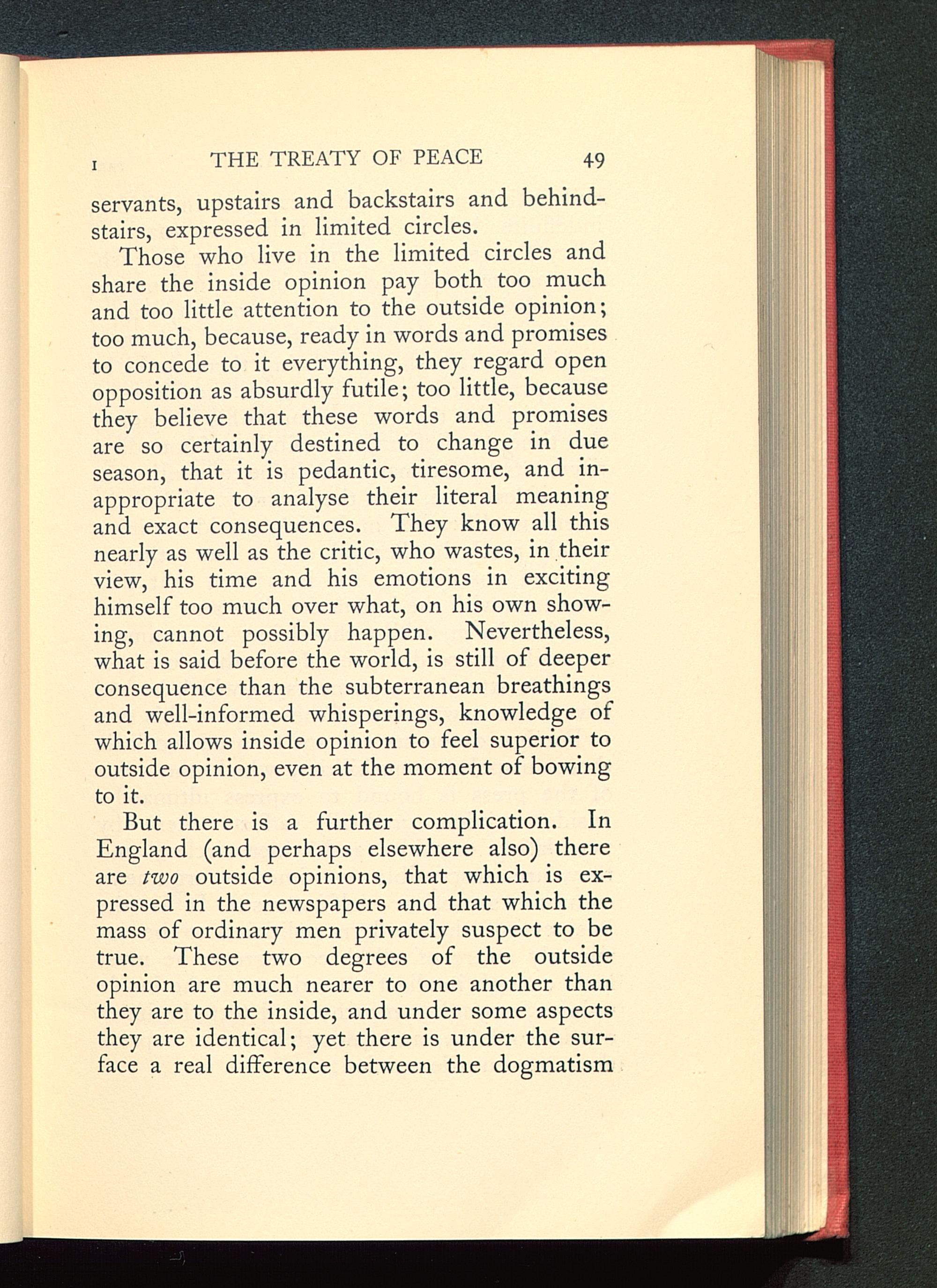 Those who live in the limited circles andshare the inside opinion pay both too muchand too little attention to the outside opinion;too much, because, ready in words and promisesto concede to it everything, they regard openopposition as absurdly futile; too little, becausethey believe that these words and promisesare so certainly destined to change in dueseason, that it is pedantic, tiresome, and in-appropriate to analyse their literal meaningand exact consequences. They know all thisnearly as well as the critic, who wastes, in theirview, his time and his emotions in excitinghimself too much over what, on his own show-ing, cannot possibly happen. Nevertheless,what is said before the world, is still of deeperconsequence than the subterranean breathingsand well-informed whisperings, knowledge ofwhich allows inside opinion to feel superior tooutside opinion, even at the moment of bowingto it.