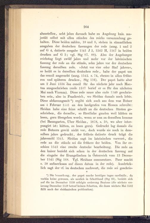 abzustellen, acht jähre darnach habe zu Augsburg kais. ma-jestät selbst mit allen ständen des reichs Versammlung ge-halten. Diese beiden zahlen, 18 und 8, stehen in sämmtlichenausgaben der deutschen fassungen der rede (ausg. 1 und 2auf G 4, datierte ausgäbe 1541 J 2, 1542 H, 1 507 in beidendrucken auf G 3; vgl. Stg 87. 88). Also der Augsburgerreichstag liegt zwölf jähre und mehr vor der lateinischenfassung der rede an die stände, zehn jähre vor der deutschenfassung derselben rede. »Jetzt vor vier oder fünf jähren«,so heißt es in derselben deutschen rede , habe der papst umdas concil angesucht (ausg. 1542. s. 74, ebenso in allen frühe-ren und späteren drucken, Stg 116). Der papst hatte aberam 2 Juni 1536 das concil für das nächste jähr nach Man-tua ausgeschrieben (ende 1537 berief er es für den nächstenMai nach Vicenza ). Diese rede muss also ende 1 540 geschrie-ben sein, also in Frankreich , wo Sleidan damals noch lebte.Diese abfassungszeit *) ergibt sich auch aus dem was Butzeram 4 Februnr 15 11 an den laudgrafen von Hessen schreibt:Sleidan habe eine feine schrift an die deutschen fürsten ge-schrieben, die derselbe, so fürstliche gnaden weil hätten zulesen, gern übergeben werde, wenn er nun zu derselben komme(bei Baumgarten, Uber Sleidan, 1878, s. 59, wo aber inter-pungirt ist: hätten, zu lesen gern). Gedruckt lag damals dierede Bntzern gewiß nicht vor, doch wurde sie noch in dem-selben jähre gedruckt, der trübste datierte druck trägt dieJahreszahl 1511. Sleidan sagt im lateinischen vorwort, dierede an die stände sei die frühere der beiden. Von ihr er-schien 1512 eine zweite deutsche bearbeitung. Die rede anden kaiser bezieht sich schon in der deutschen fassung aufdie eingäbe der Evangelischen in Österreich vom 13 Decem-ber 1541 (Stg 168. Vgl. Sleidans commentare. Paur machts. 38 aufmerksam auf dieses datum in der rede). Ausdrück-lich sagt der vf. im deutschen nachwort, die rede sei geschrie-