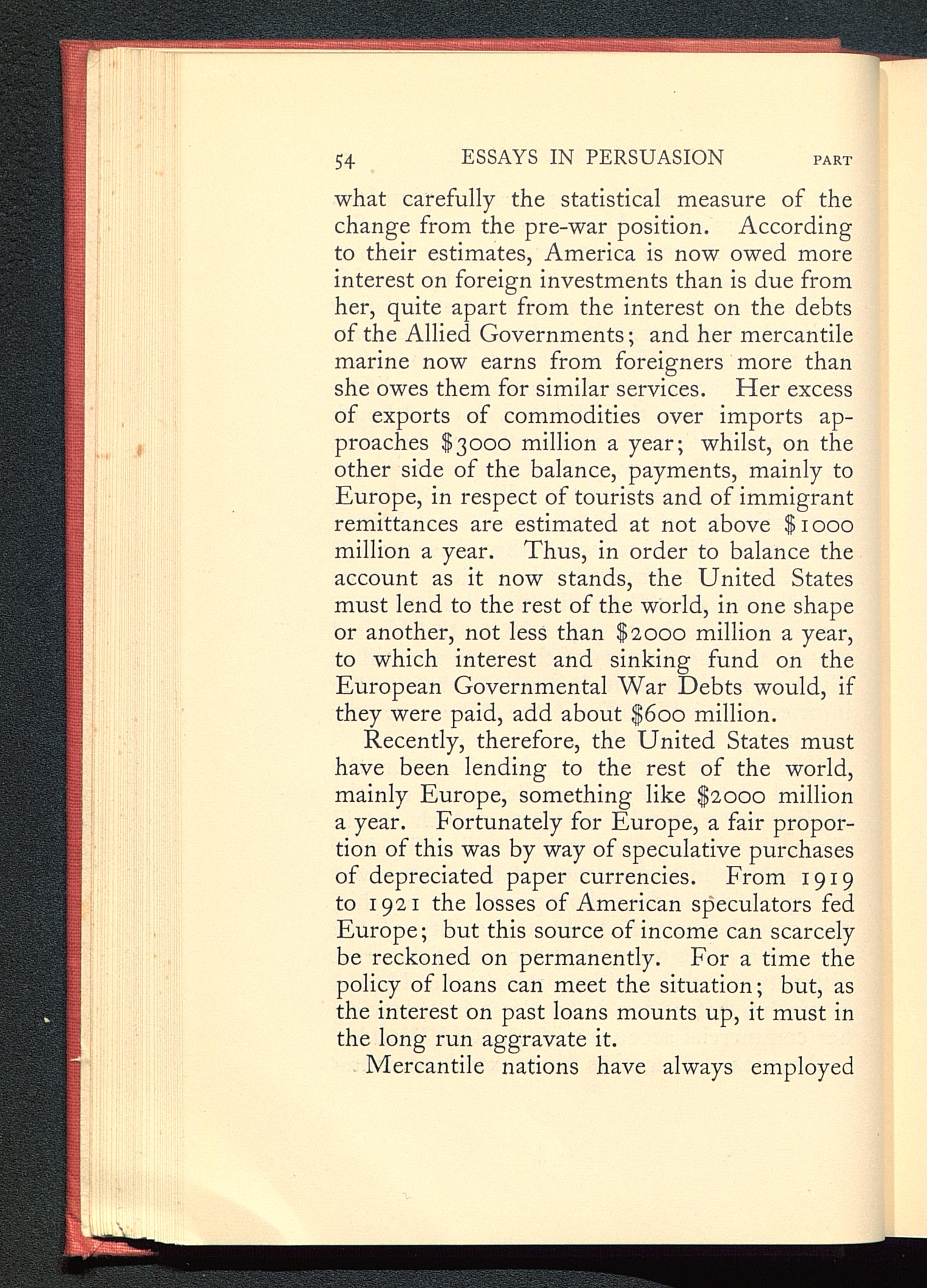 Recently, therefore, the United States musthave been lending to the rest of the world,mainly Europe , something like $2000 milliona year. Fortunately for Europe , a fair propor-tion of this was by way of speculative purchasesof depreciated paper currencies. From 1919to 1921 the losses of American speculators fedEurope ; but this source of income can scarcelybe reckoned on permanently. For a time thepolicy of loans can meet the situation; but, asthe interest on past loans mounts up, it must inthe long run aggravate it.