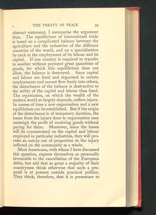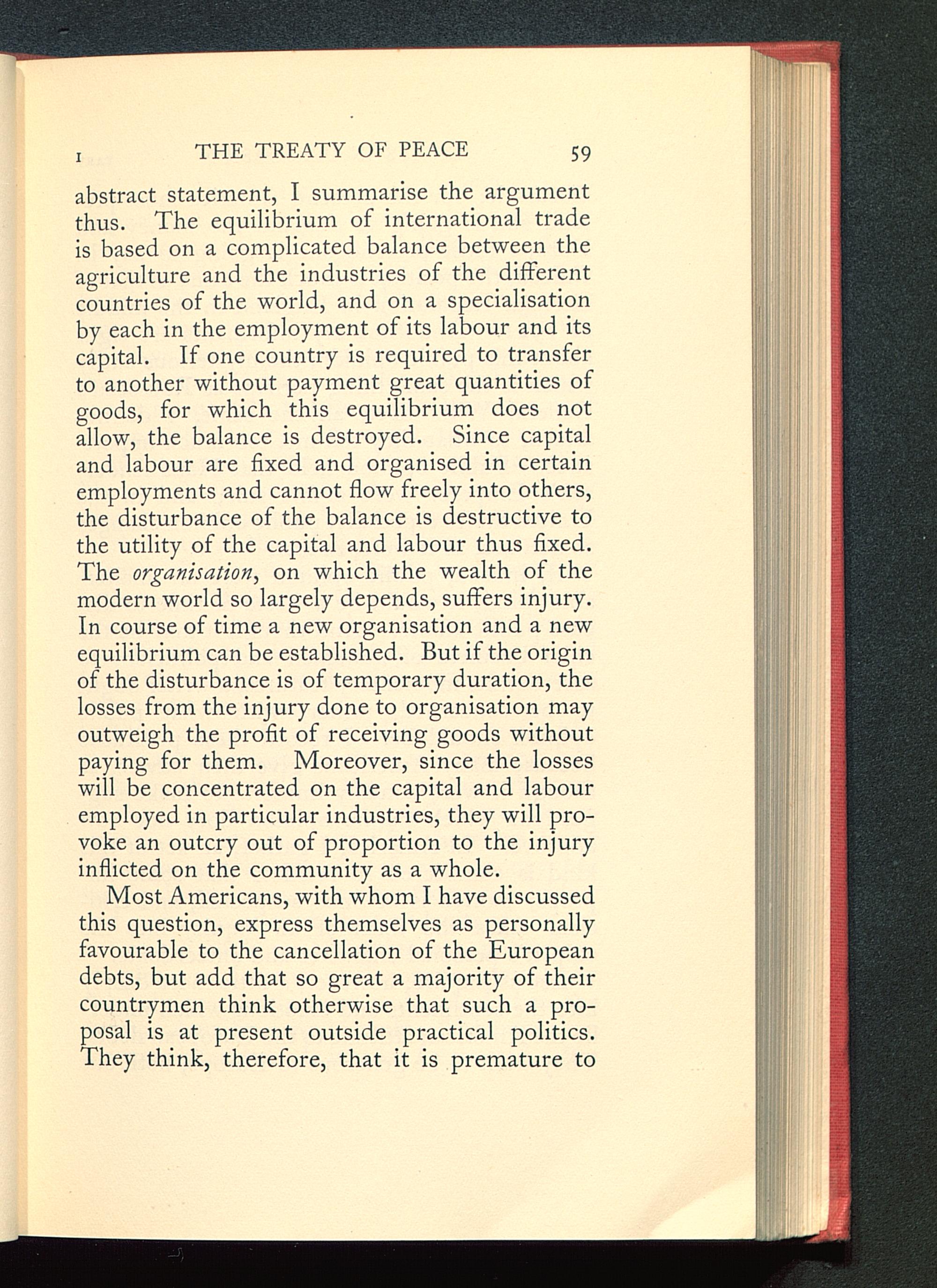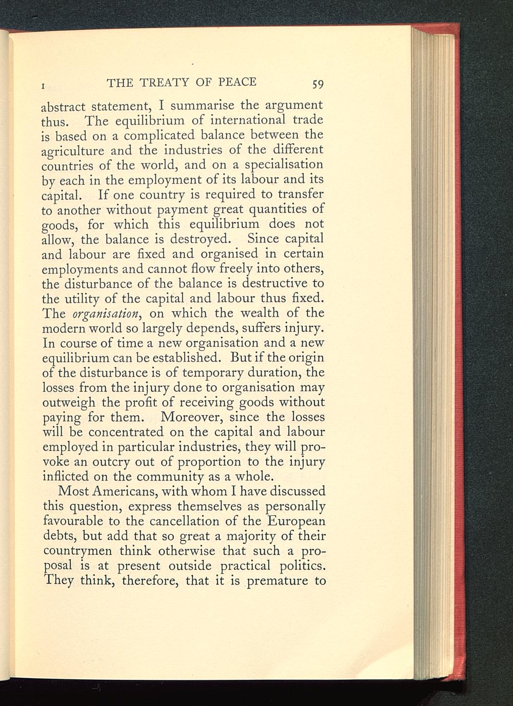 abstract statement, I summarise the argumentthus. The equilibrium of international tradeis based on a complicated balance between theagriculture and the industries of the differentcountries of the world, and on a specialisationby each in the employment of its labour and itscapital. If one country is required to transferto another without payment great quantities ofgoods, for which this equilibrium does notallow, the balance is destroyed. Since capitaland labour are fixed and organised in certainemployments and cannot flow freely into others,the disturbance of the balance is destructive tothe utility of the capital and labour thus fixed.The organisation , on which the wealth of themodern world so largely depends, suffers injury.In course of time a new organisation and a newequilibrium can be established. But if the originof the disturbance is of temporary duration, thelosses from the injury done to organisation mayoutweigh the profit of receiving goods withoutpaying for them. Moreover, since the losseswill be concentrated on the capital and labouremployed in particular industries, they will pro-voke an outcry out of proportion to the injuryinflicted on the community as a whole.