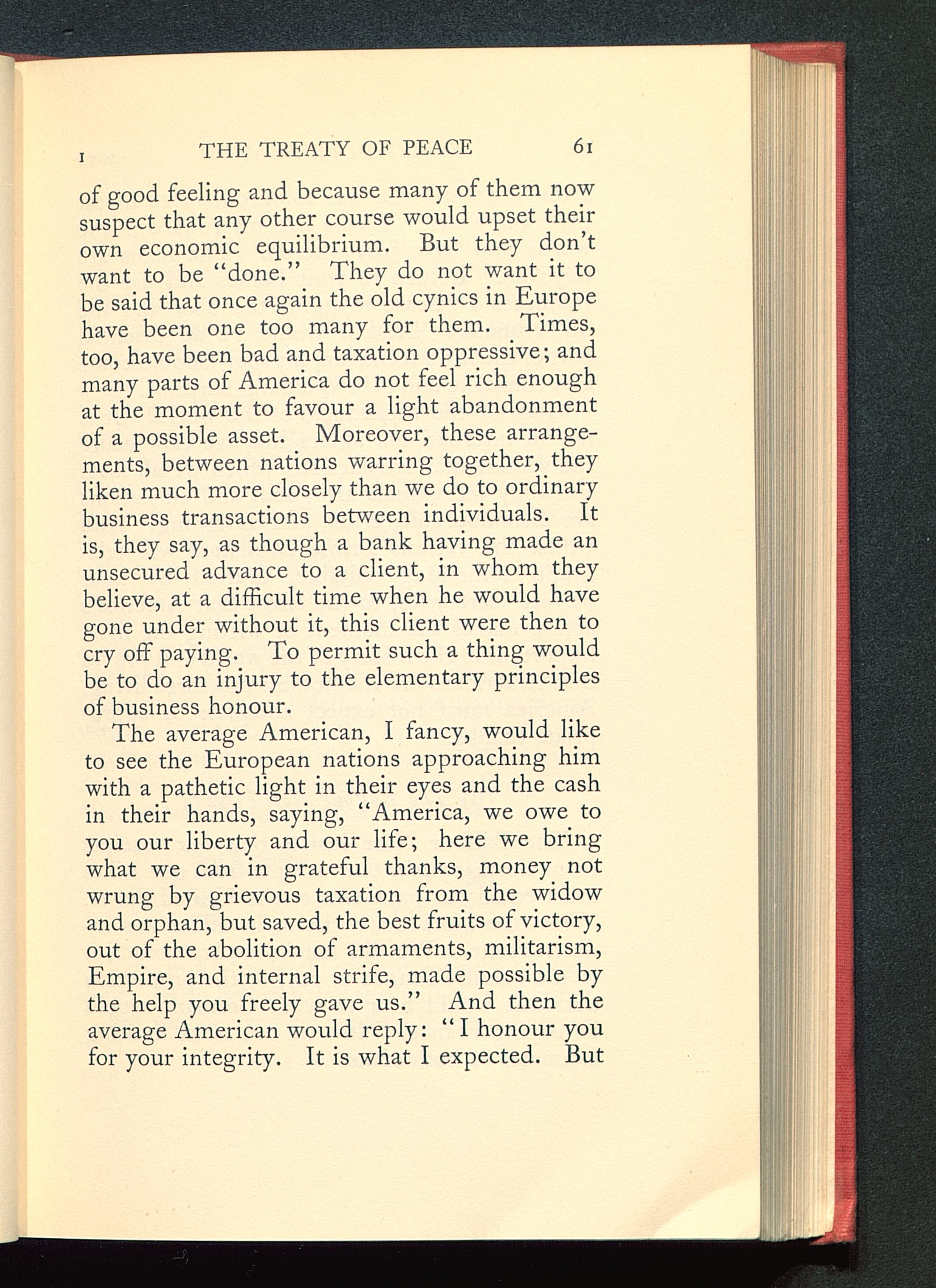 The average American, I fancy, would liketo see the European nations approaching himwith a pathetic light in their eyes and the cashin their hands, saying, “America, we owe toyou our liberty and our life; here we bringwhat we can in grateful thanks, money notwrung by grievous taxation from the widowand orphan, but saved, the best fruits of victory,out of the abolition of armaments, militarism,Empire, and internal strife, made possible bythe help you freely gave us.” And then theaverage American would reply: “ I honour youfor your integrity. It is what I expected. But