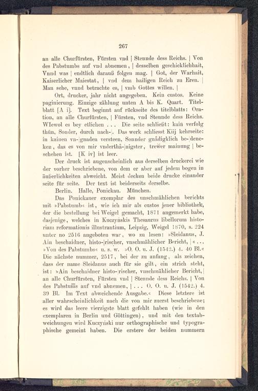 Das Ponickauer exemplar des unschtniihlichen berichtsmit »Pabstumb« ist, wie ich mir als custos jener bibliothek,der die bestellung bei Weigel gemacht, 1871 angemerkt habe,dasjenige, welches in Kuczyhskis Thesaurus libellorum histo-riam reformationis illustrantium, Leipzig , Weigel 1870, s. 224unter no 2510 augeboten war, wo zu lesen: »Sleidanus, J.Ain beschaidner, histo-|rischer, vnschmählicher Bericht, j « . ..»Von des Pabstumbs« u. s. w. »0. 0. u. J. (1542.) •!. 40 El.«Die nächste nummer, 2517, bei der zu anfang , als zeichen,dass der namc Sleidanus auch für sie gilt, ein strich steht,ist: »Ain beschaidner histo-riscber, vnschmählicher Bericht,)an alle Churfürsten, Fürsten vnd | Stennde dess Reichs. | Vondes Pabstuüis auf vnd abnemen, | . . . 0. 0. u. J. (1542.) 4.39 Bl. Im Text abweichende Ausgabe.« Diese letztere istaller Wahrscheinlichkeit nach die von mir zuerst beschriebene;es wird das leere vierzigste blatt gefehlt haben (wie in deuexemplaren in Berlin und Ciöttingen) , und mit den textab-weichungen wird Kuczyhski nur orthographische und typogra-phische gemeint haben. Die erstere der beiden nummern