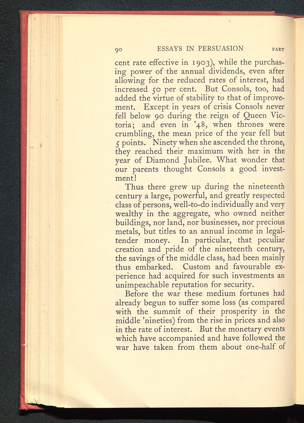 Thus there grew up during the nineteenthcentury a large, powerful, and greatly respectedclass of persons, well-to-do individually and verywealthy in the aggregate, who owned neitherbuildings, nor land, nor businesses, nor preciousmetals, but titles to an annual income in legal-tender money. In particular, that peculiarcreation and pride of the nineteenth century,the savings of the middle class, had been mainlythus embarked. Custom and favourable ex-perience had acquired for such investments anunimpeachable reputation for security.