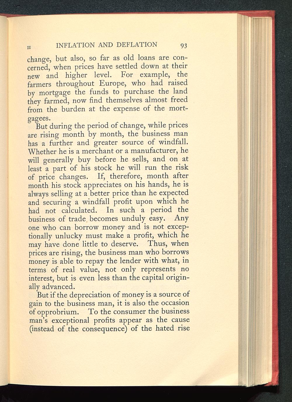 But during the period of change, while pricesare rising month by month, the business manhas a further and greater source of windfall.Whether he is a merchant or a manufacturer, hewill generally buy before he sells, and on atleast a part of his stock he will run the riskof price changes. If, therefore, month aftermonth his stock appreciates on his hands, he isalways selling at a better price than he expectedand securing a windfall profit upon which hehad not calculated. In such a period thebusiness of trade becomes unduly easy. Anyone who can borrow money and is not excep-tionally unlucky must make a profit, which hemay have done little to deserve. Thus, whenprices are rising, the business man who borrowsmoney is able to repay the lender with what, interms of real value, not only represents nointerest, but is even less than the capital origin-ally advanced.