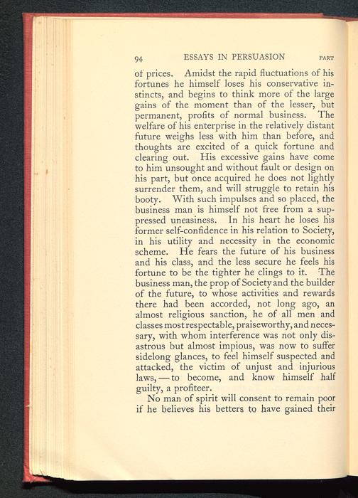 of prices. Amidst the rapid fluctuations of hisfortunes he himself loses his conservative in-stincts, and begins to think more of the largegains of the moment than of the lesser, butpermanent, profits of normal business. Thewelfare of his enterprise in the relatively distantfuture weighs less with him than before, andthoughts are excited of a quick fortune andclearing out. His excessive gains have cometo him unsought and without fault or design onhis part, but once acquired he does not lightlysurrender them, and will struggle to retain hisbooty. With such impulses and so placed, thebusiness man is himself not free from a sup-pressed uneasiness. In his heart he loses hisformer self-confidence in his relation to Society ,in his utility and necessity in the economicscheme. He fears the future of his businessand his class, and the less secure he feels hisfortune to be the tighter he clings to it. Thebusiness man, the prop of Society and the builderof the future, to whose activities and rewardsthere had been accorded, not long ago, analmost religious sanction, he of all men andclasses most respectable, praiseworthy, and neces-sary, with whom interference was not only dis-astrous but almost impious, was now to suffersidelong glances, to feel himself suspected andattacked, the victim of unjust and injuriouslaws, — to become, and know himself halfguilty, a profiteer.