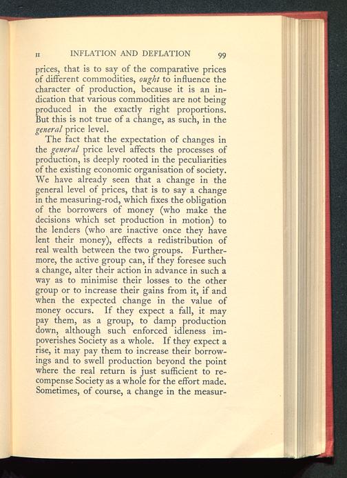 The fact that the expectation of changes inthe general price level affects the processes ofproduction, is deeply rooted in the peculiaritiesof the existing economic organisation of society.We have already seen that a change in thegeneral level of prices, that is to say a changein the measuring-rod, which fixes the obligationof the borrowers of money (who make thedecisions which set production in motion) tothe lenders (who are inactive once they havelent their money), effects a redistribution ofreal wealth between the two groups. Further-more, the active group can, if they foresee sucha change, alter their action in advance in such away as to minimise their losses to the othergroup or to increase their gains from it, if andwhen the expected change in the value ofmoney occurs. If they expect a fall, it maypay them, as a group, to damp productiondown, although such enforced idleness im-poverishes Society as a whole. If they expect arise, it may pay them to increase their borrow-ings and to swell production beyond the pointwhere the real return is just sufficient to re-compense Society as a whole for the effort made.Sometimes, of course, a change in the measur-