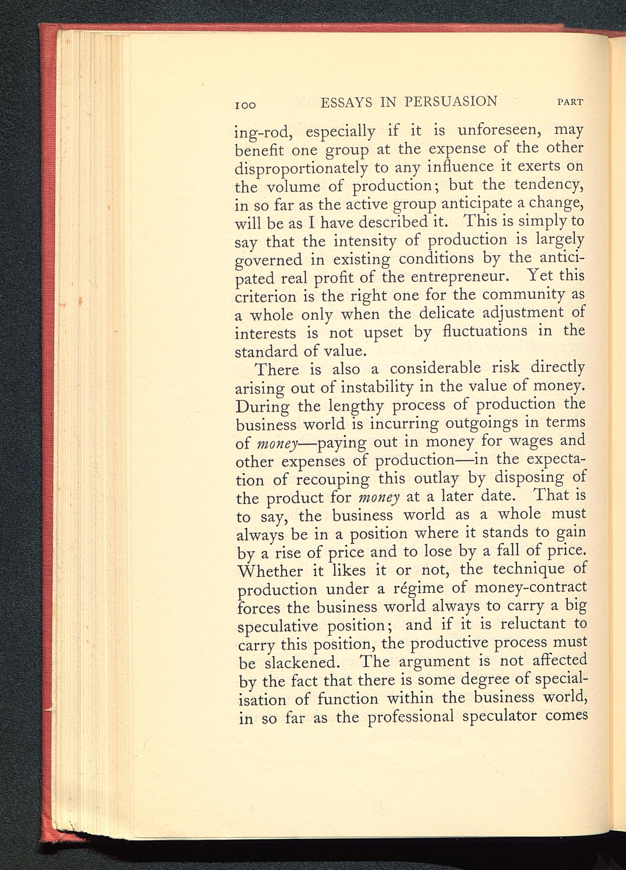 There is also a considerable risk directlyarising out of instability in the value of money.During the lengthy process of production thebusiness world is incurring outgoings in termsof money —paying out in money for wages andother expenses of production—in the expecta-tion of recouping this outlay by disposing ofthe product for money at a later date. That isto say, the business world as a whole mustalways be in a position where it stands to gainby a rise of price and to lose by a fall of price.Whether it likes it or not, the technique ofproduction under a regime of money-contractforces the business world always to carry a bigspeculative position; and if it is reluctant tocarry this position, the productive process mustbe slackened. The argument is not affectedby the fact that there is some degree of special-isation of function within the business world,in so far as the professional speculator comes