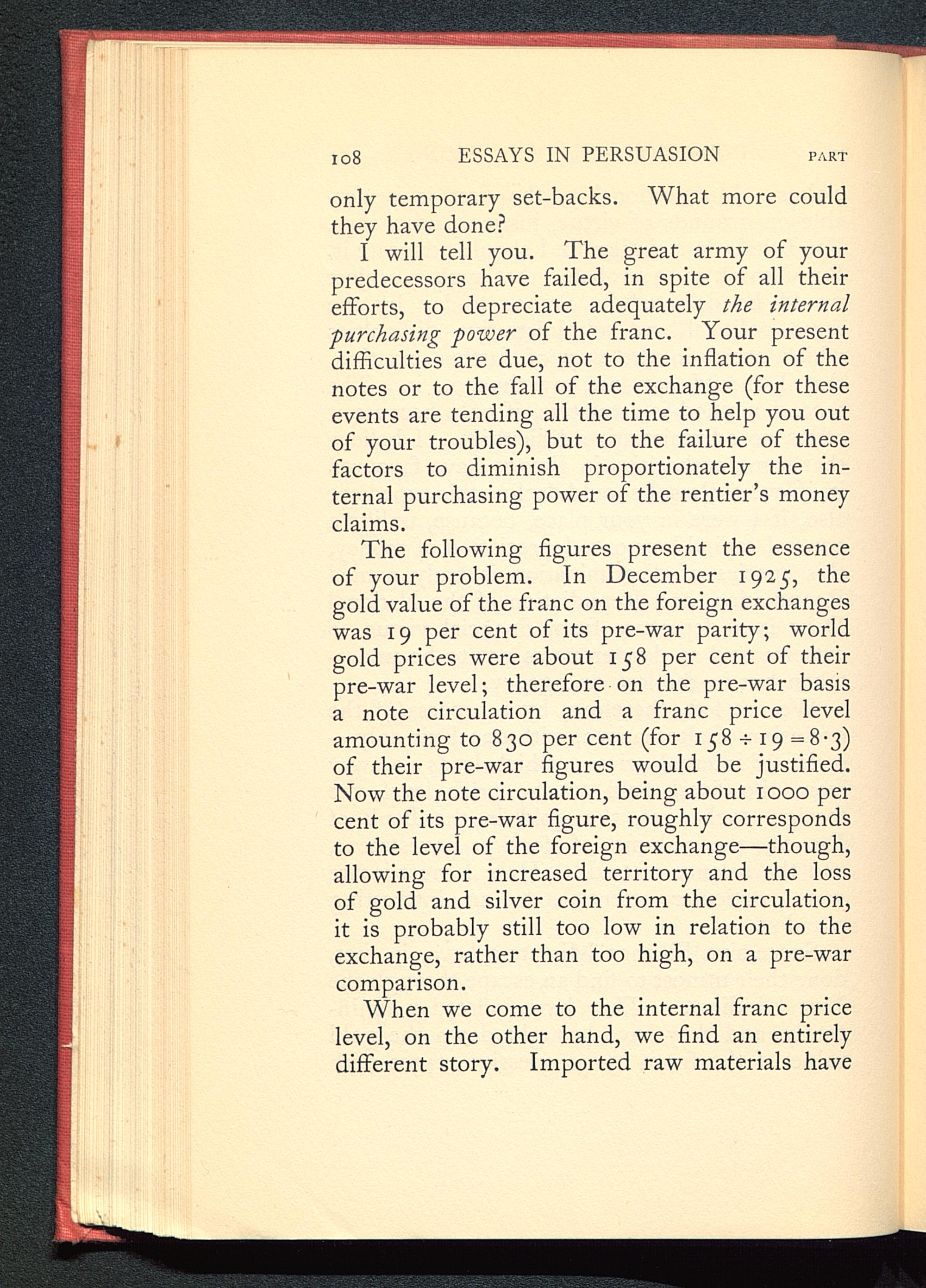 I will tell you. The great army of yourpredecessors have failed, in spite of all theirefforts, to depreciate adequately the internal-purchasing power of the franc. Your presentdifficulties are due, not to the inflation of thenotes or to the fall of the exchange (for theseevents are tending all the time to help you outof your troubles), but to the failure of thesefactors to diminish proportionately the in-ternal purchasing power of the rentier’s moneyclaims.