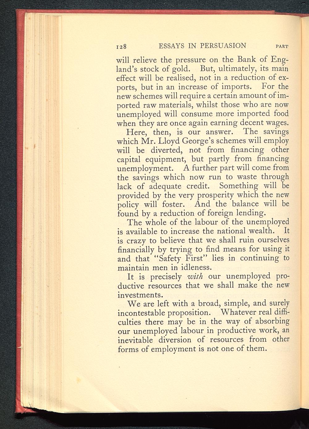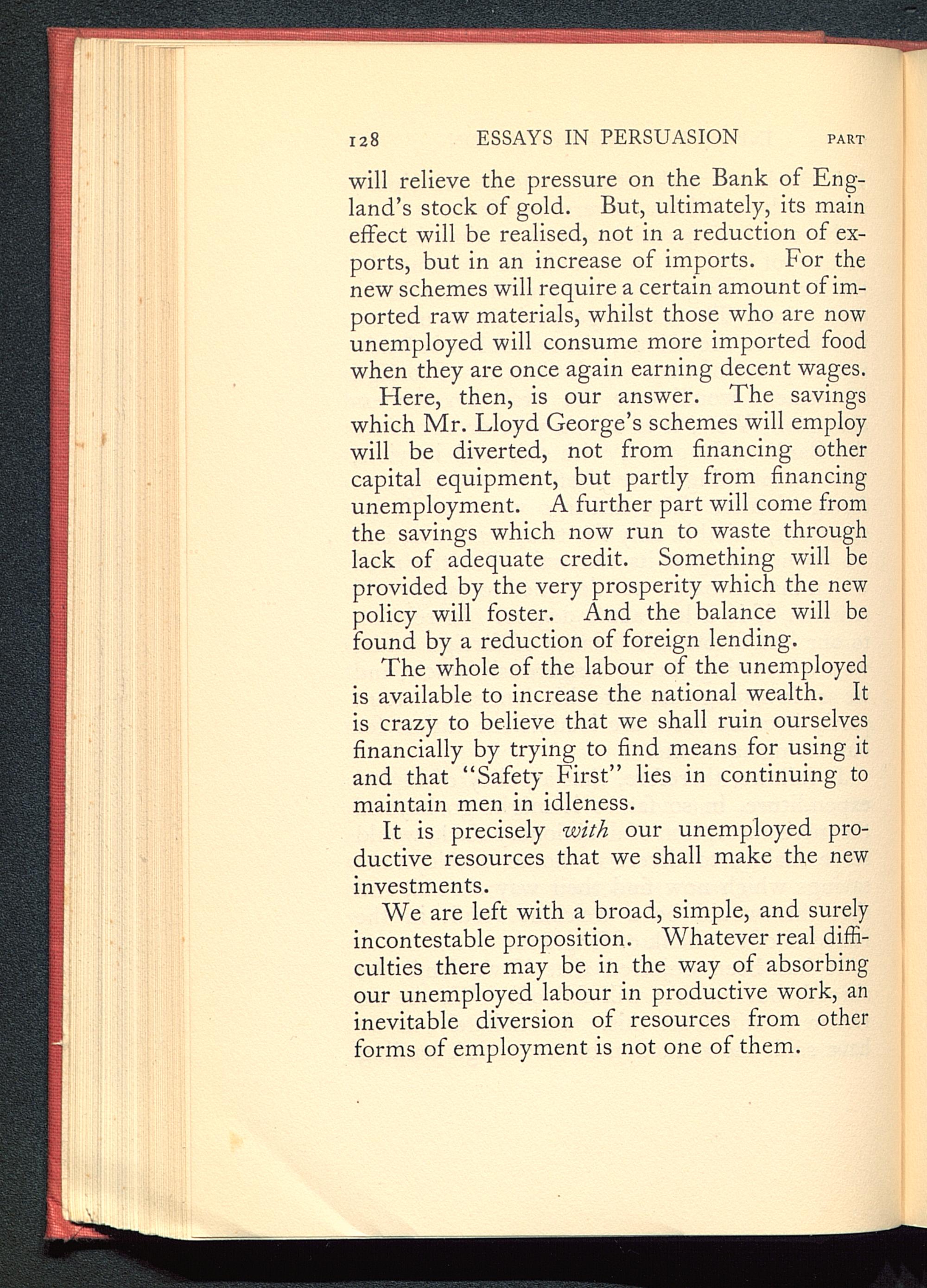 We are left with a broad, simple, and surelyincontestable proposition. Whatever real diffi-culties there may be in the way of absorbingour unemployed labour in productive work, aninevitable diversion of resources from otherforms of employment is not one of them.