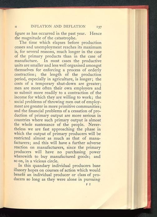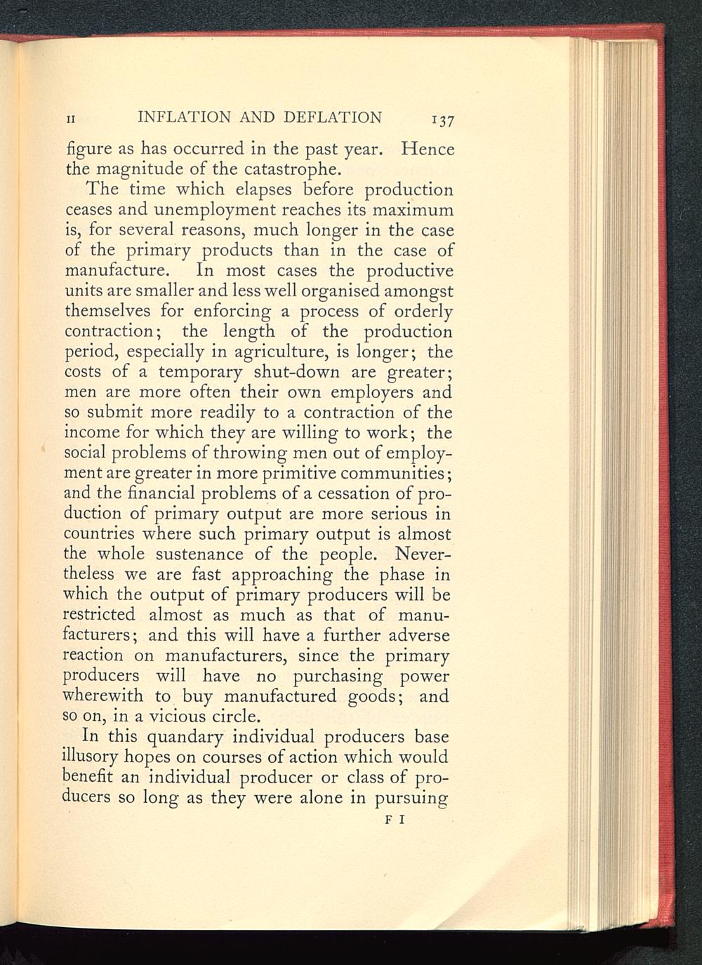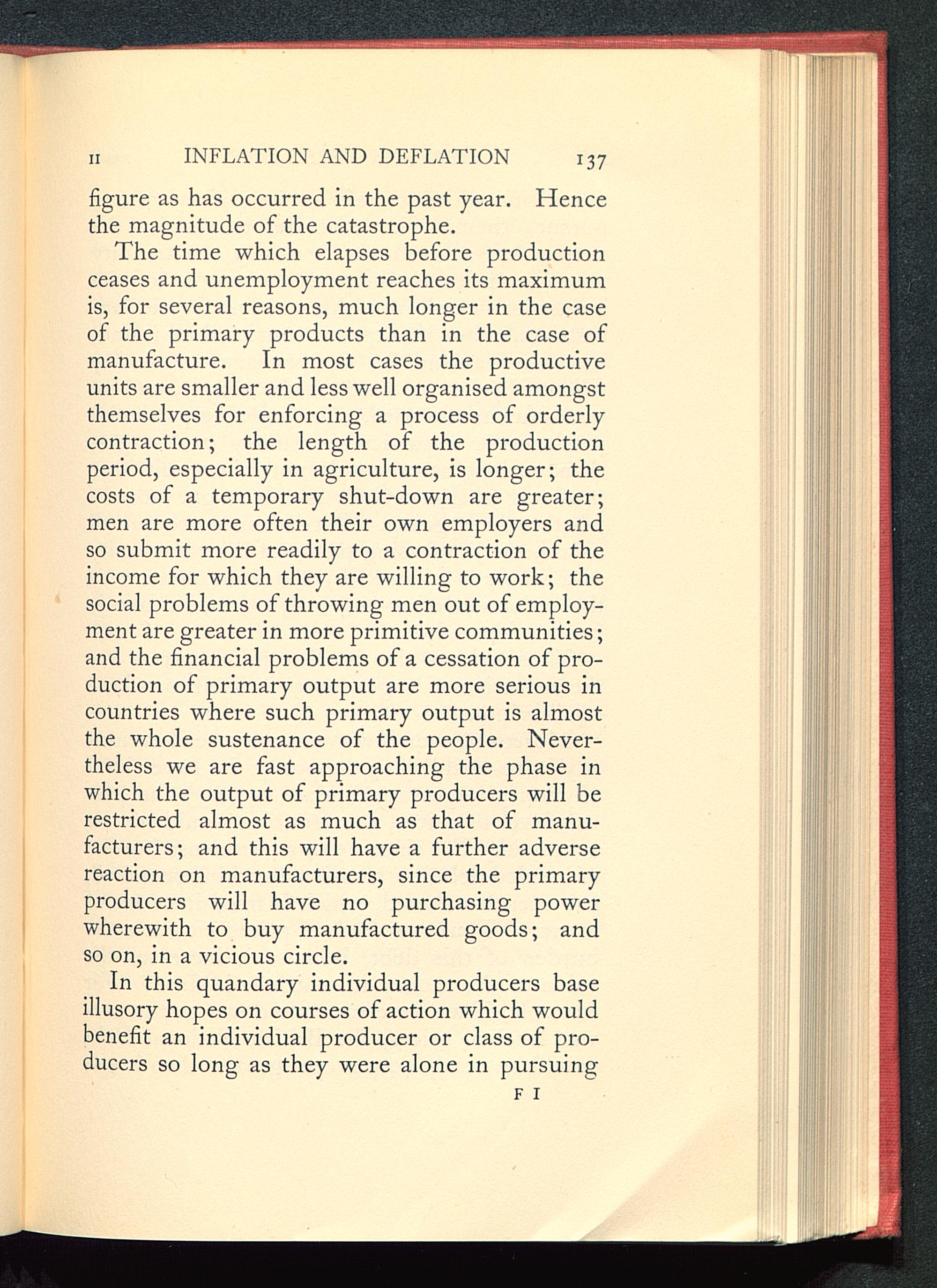 The time which elapses before productionceases and unemployment reaches its maximumis, for several reasons, much longer in the caseof the primary products than in the case ofmanufacture. In most cases the productiveunits are smaller and less well organised amongstthemselves for enforcing a process of orderlycontraction; the length of the productionperiod, especially in agriculture, is longer; thecosts of a temporary shut-down are greater;men are more often their own employers andso submit more readily to a contraction of theincome for which they are willing to work; thesocial problems of throwing men out of employ-ment are greater in more primitive communities;and the financial problems of a cessation of pro-duction of primary output are more serious incountries where such primary output is almostthe whole sustenance of the people. Never-theless we are fast approaching the phase inwhich the output of primary producers will berestricted almost as much as that of manu-facturers; and this will have a further adversereaction on manufacturers, since the primaryproducers will have no purchasing powerwherewith to buy manufactured goods; andso on, in a vicious circle.
