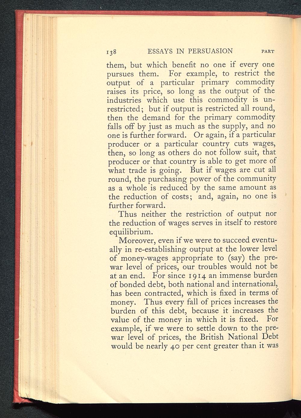 Moreover, even if we were to succeed eventu-ally in re-establishing output at the lower levelof money-wages appropriate to (say) the pre-war level of prices, our troubles would not beat an end. For since 1914 an immense burdenof bonded debt, both national and international,has been contracted, which is fixed in terms ofmoney. Thus every fall of prices increases theburden of this debt, because it increases thevalue of the money in which it is fixed. Forexample, if we were to settle down to the pre-war level of prices, the British National Debtwould be nearly 40 per cent greater than it was