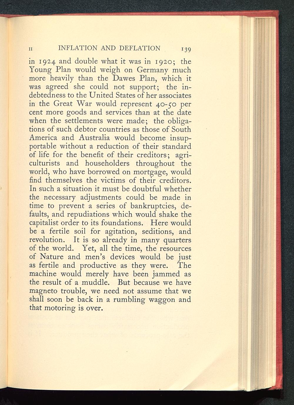 in 1924 and double what it was in 1920; theYoung Plan would weigh on Germany muchmore heavily than the Dawes Plan , which itwas agreed she could not support; the in-debtedness to the United States of her associatesin the Great War would represent 40-50 percent more goods and services than at the datewhen the settlements were made; the obliga-tions of such debtor countries as those of SouthAmerica and Australia would become insup-portable without a reduction of their standardof life for the benefit of their creditors; agri-culturists and householders throughout theworld, who have borrowed on mortgage, wouldfind themselves the victims of their creditors.In such a situation it must be doubtful whetherthe necessary adjustments could be made intime to prevent a series of bankruptcies, de-faults, and repudiations which would shake thecapitalist order to its foundations. Here wouldbe a fertile soil for agitation, seditions, andrevolution. It is so already in many quartersof the world. Yet, all the time, the resourcesof Nature and men’s devices would be justas fertile and productive as they were. Themachine would merely have been jammed asthe result of a muddle. But because we havemagneto trouble, we need not assume that weshall soon be back in a rumbling waggon andthat motoring is over.