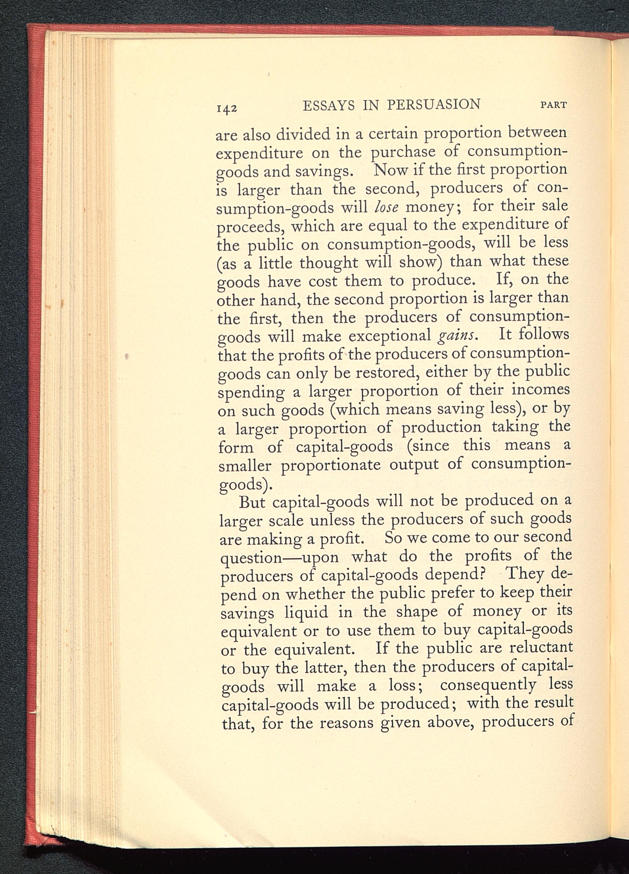 are also divided in a certain proportion betweenexpenditure on the purchase of consumption-goods and savings. Now if the first proportionis larger than the second, producers of con-sumption-goods will lose money; for their saleproceeds, which are equal to the expenditure ofthe public on consumption-goods, will be less(as a little thought will show) than what thesegoods have cost them to produce. If, on theother hand, the second proportion is larger thanthe first, then the producers of consumption-goods will make exceptional gains. It followsthat the profits of the producers of consumption-goods can only be restored, either by the publicspending a larger proportion of their incomeson such goods (which means saving less), or bya larger proportion of production taking theform of capital-goods (since this means asmaller proportionate output of consumption-goods).