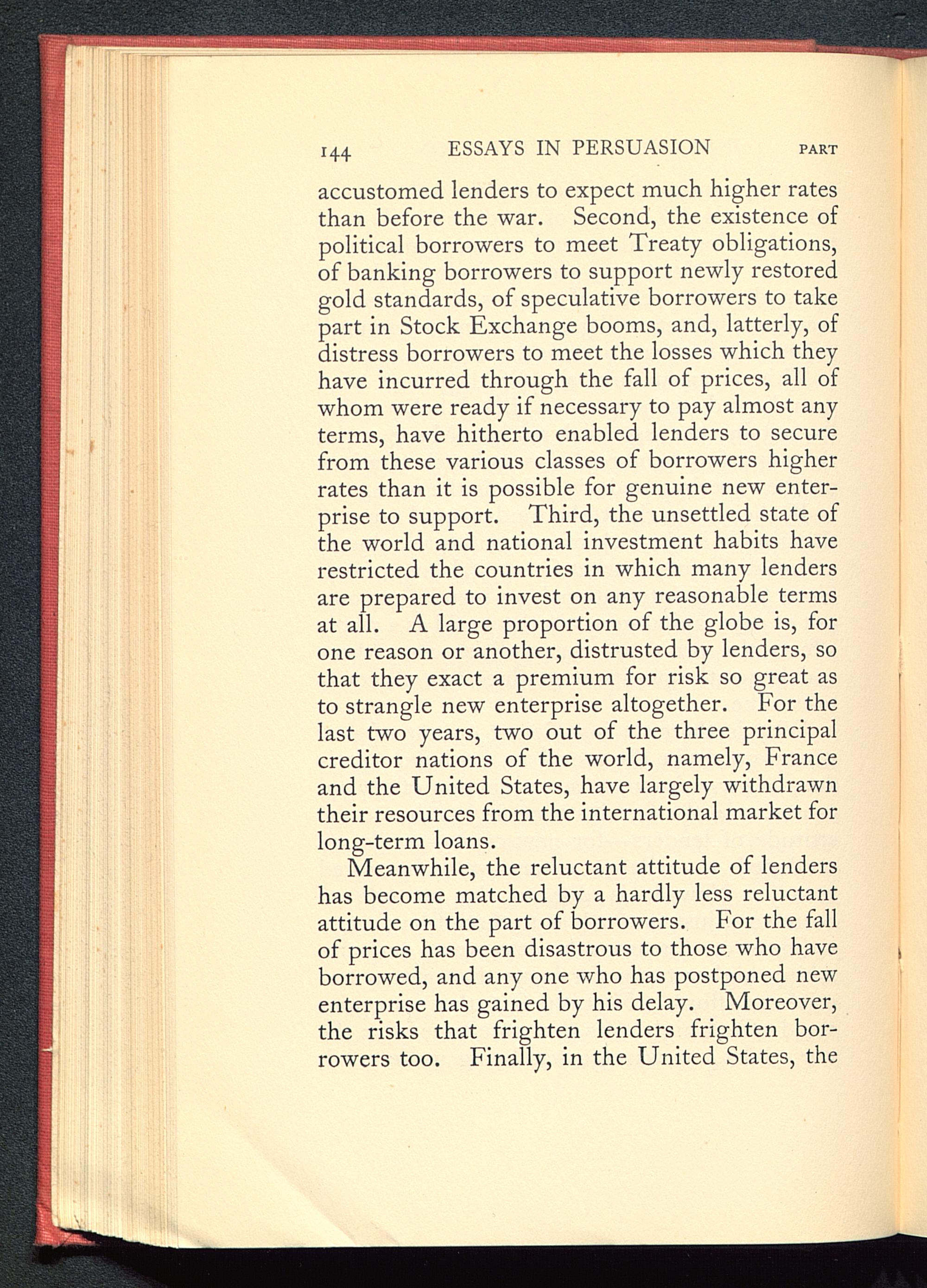 accustomed lenders to expect much higher ratesthan before the war. Second, the existence ofpolitical borrowers to meet Treaty obligations,of banking borrowers to support newly restoredgold standards, of speculative borrowers to takepart in Stock Exchange booms, and, latterly, ofdistress borrowers to meet the losses which theyhave incurred through the fall of prices, all ofwhom were ready if necessary to pay almost anyterms, have hitherto enabled lenders to securefrom these various classes of borrowers higherrates than it is possible for genuine new enter-prise to support. Third, the unsettled state ofthe world and national investment habits haverestricted the countries in which many lendersare prepared to invest on any reasonable termsat all. A large proportion of the globe is, forone reason or another, distrusted by lenders, sothat they exact a premium for risk so great asto strangle new enterprise altogether. For thelast two years, two out of the three principalcreditor nations of the world, namely, France and the United States , have largely withdrawntheir resources from the international market forlong-term loans.