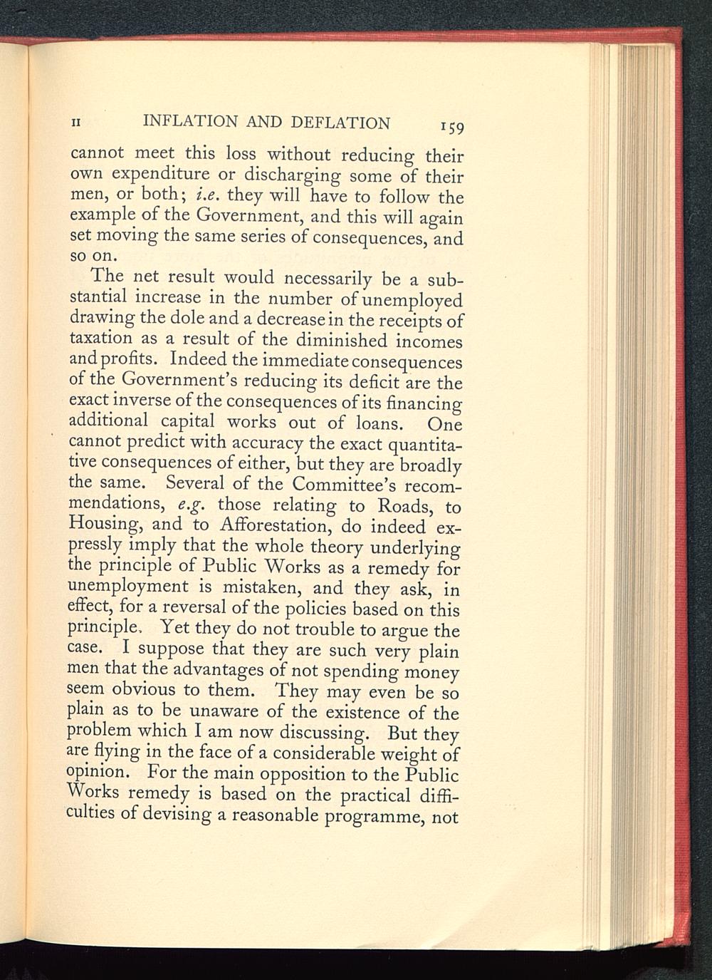 The net result would necessarily be a sub-stantial increase in the number of unemployeddrawing the dole and a decrease in the receipts oftaxation as a result of the diminished incomesand profits. Indeed the immediate consequencesof the Government’s reducing its deficit are theexact inverse of the consequences of its financingadditional capital works out of loans. Onecannot predict with accuracy the exact quantita-tive consequences of either, but they are broadlythe same. Several of the Committee’s recom-mendations, e.g. those relating to Roads, toHousing, and to Afforestation, do indeed ex-pressly imply that the whole theory underlyingthe principle of Public Works as a remedy forunemployment is mistaken, and they ask, ineffect, for a reversal of the policies based on thisprinciple, Yet they do not trouble to argue thecase. I suppose that they are such very plainmen that the advantages of not spending moneyseem obvious to them. They may even be soplain as to be unaware of the existence of theproblem which I am now discussing. But theyare flying in the face of a considerable weight ofopinion. For the main opposition to the PublicWorks remedy is based on the practical diffi-culties of devising a reasonable programme, not