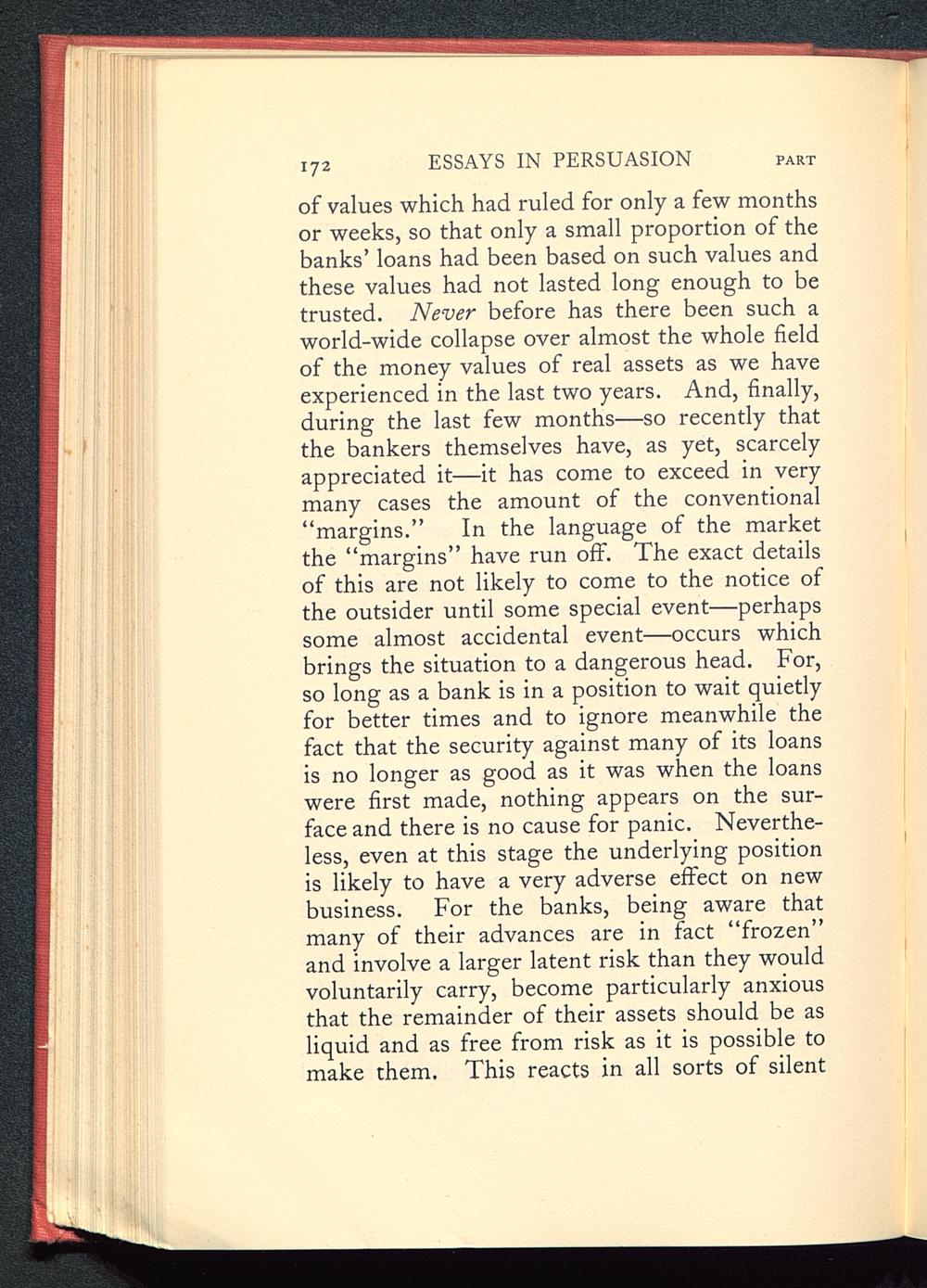 of values which had ruled for only a few monthsor weeks, so that only a small proportion of thebanks’ loans had been based on such values andthese values had not lasted long enough to betrusted. Never before has there been such aworld-wide collapse over almost the whole fieldof the money values of real assets as we haveexperienced in the last two years. And, finally,during the last few months—so recently thatthe bankers themselves have, as yet, scarcelyappreciated it—it has come to exceed in verymany cases the amount of the conventional“margins.” In the language of the marketthe “margins” have run off. The exact detailsof this are not likely to come to the notice ofthe outsider until some special event—perhapssome almost accidental event—occurs whichbrings the situation to a dangerous head. For,so long as a bank is in a position to wait quietlyfor better times and to ignore meanwhile thefact that the security against many of its loansis no longer as good as it was when the loanswere first made, nothing appears on the sur-face and there is no cause for panic. Neverthe-less, even at this stage the underlying positionis likely to have a very adverse effect on newbusiness. For the banks, being aware thatmany of their advances are in fact “frozen”and involve a larger latent risk than they wouldvoluntarily carry, become particularly anxiousthat the remainder of their assets should be asliquid and as free from risk as it is possible tomake them. This reacts in all sorts of silent